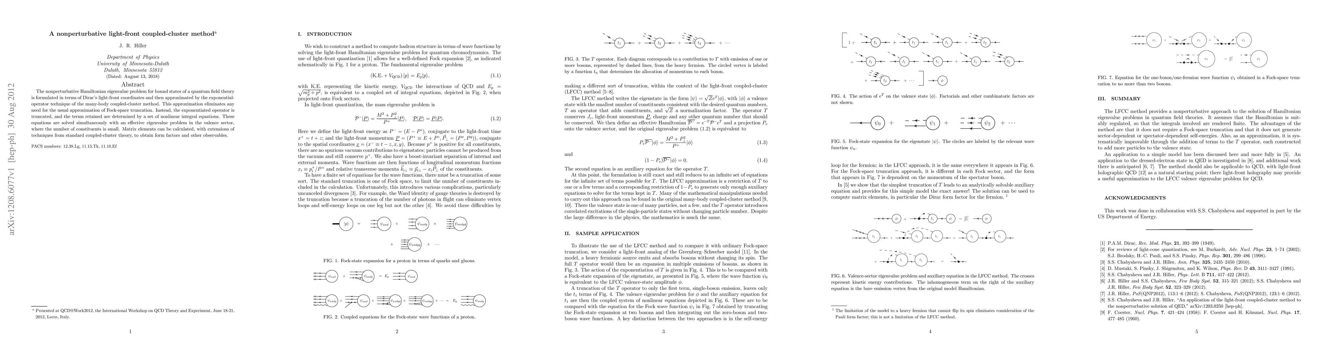 This paper introduces a nonperturbative light-front coupled-cluster method to solve the Hamiltonian eigenvalue problem for quantum field theory bound states, eliminating Fock-space truncation and using nonlinear integral equations to determine retained terms. Matrix elements are calculated to obtain form factors and other observables.
