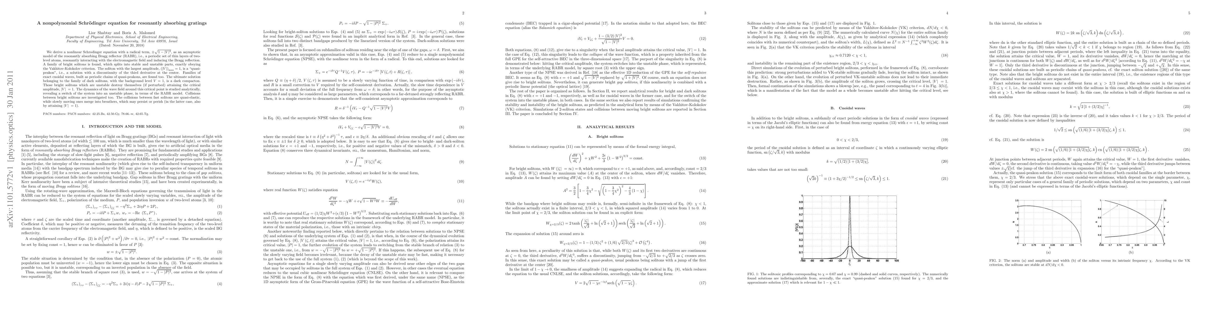 This paper derives a nonlinear Schrödinger equation with a radical term to model resonantly absorbing gratings, revealing bright solitons that split into stable and unstable parts, obeying the Vakhitov-Kolokolov criterion. It also finds explicit analytical forms for quasi-peakons, cnoidal waves, and dark compacton solitons, and studies their dynamics and interactions.