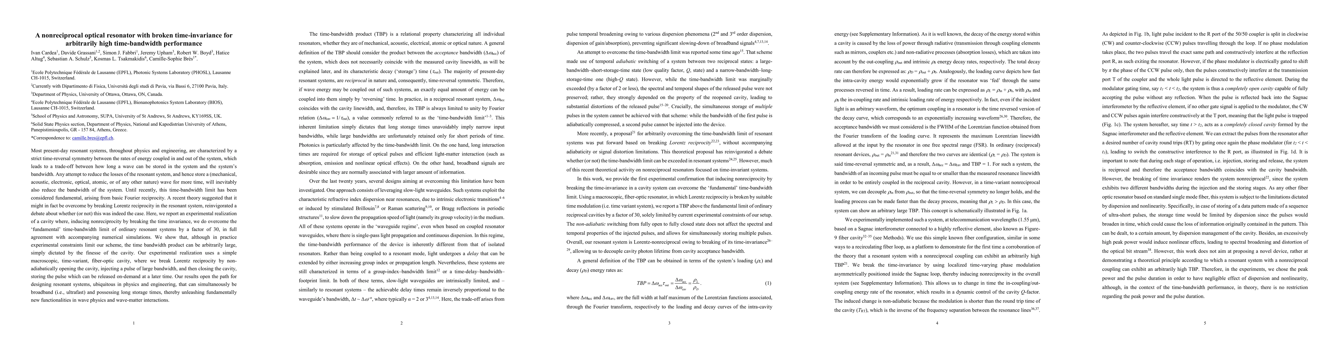 Most present-day resonant systems, throughout physics and engineering, are characterized by a strict time-reversal symmetry between the rates of energy coupled in and out of the system, which leads to a trade-off between how long a wave can be stored in the system and the system bandwidth. Any attempt to reduce the losses of the resonant system, and hence store a (mechanical, acoustic, electronic, optical, atomic, or of any other nature) wave for more time, will inevitably also reduce the bandwidth of the system. Until recently, this time-bandwidth limit has been considered fundamental, arising from basic Fourier reciprocity. A recent theory suggested that it might in fact be overcome by breaking Lorentz reciprocity in the resonant system, reinvigorated a debate about whether (or not) this was indeed the case. Here, we report an experimental realization of a cavity where, inducing nonreciprocity by breaking the time invariance, we do overcome the fundamental time-bandwidth limit of ordinary resonant systems by a factor of 30, in full agreement with accompanying numerical simulations. We show that, although in practice experimental constraints limit our scheme, the time bandwidth product can be arbitrarily large, simply dictated by the finesse of the cavity. Our experimental realization uses a simple macroscopic, time-variant, fiber-optic cavity, where we break Lorentz reciprocity by non-adiabatically opening the cavity, injecting a pulse of large bandwidth, and then closing the cavity, storing the pulse which can be released on-demand at a later time. Our results open the path for designing resonant systems, ubiquitous in physics and engineering, that can simultaneously be broadband (i.e., ultrafast) and possessing long storage times, thereby unleashing fundamentally new functionalities in wave physics and wave-matter interactions.
