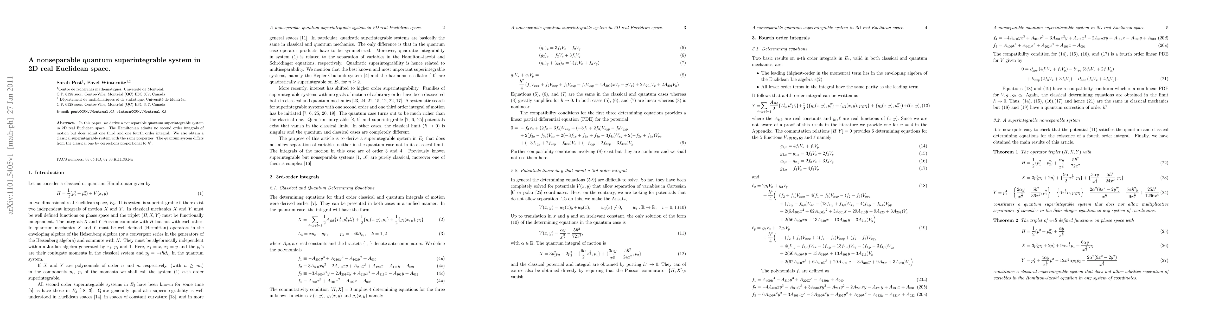 This paper presents a nonseparable quantum superintegrable system in 2D real Euclidean space with unique third and fourth order integrals, contrasting it with a corresponding classical superintegrable system, where quantum corrections are proportional to $\hbar^2$.