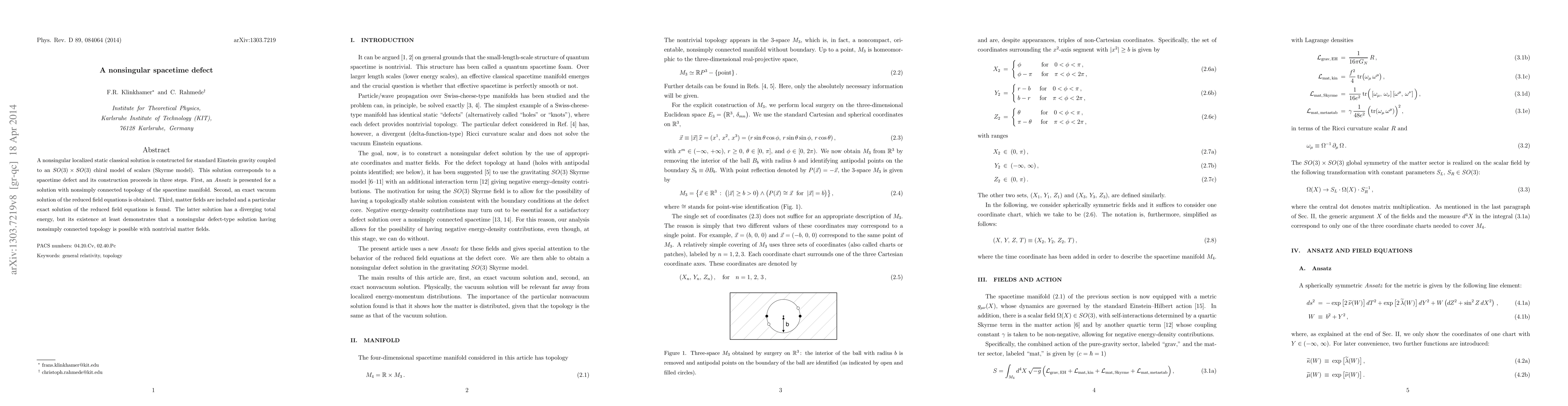 A nonsingular localized static classical solution is constructed for standard Einstein gravity coupled to an $SO(3)\times SO(3)$ chiral model of scalars (Skyrme model). This solution corresponds to a spacetime defect and its construction proceeds in three steps. First, an \textit{Ansatz} is presented for a solution with nonsimply connected topology of the spacetime manifold. Second, an exact vacuum solution of the reduced field equations is obtained. Third, matter fields are included and a particular exact solution of the reduced field equations is found. The latter solution has a diverging total energy, but its existence at least demonstrates that a nonsingular defect-type solution having nonsimply connected topology is possible with nontrivial matter fields.