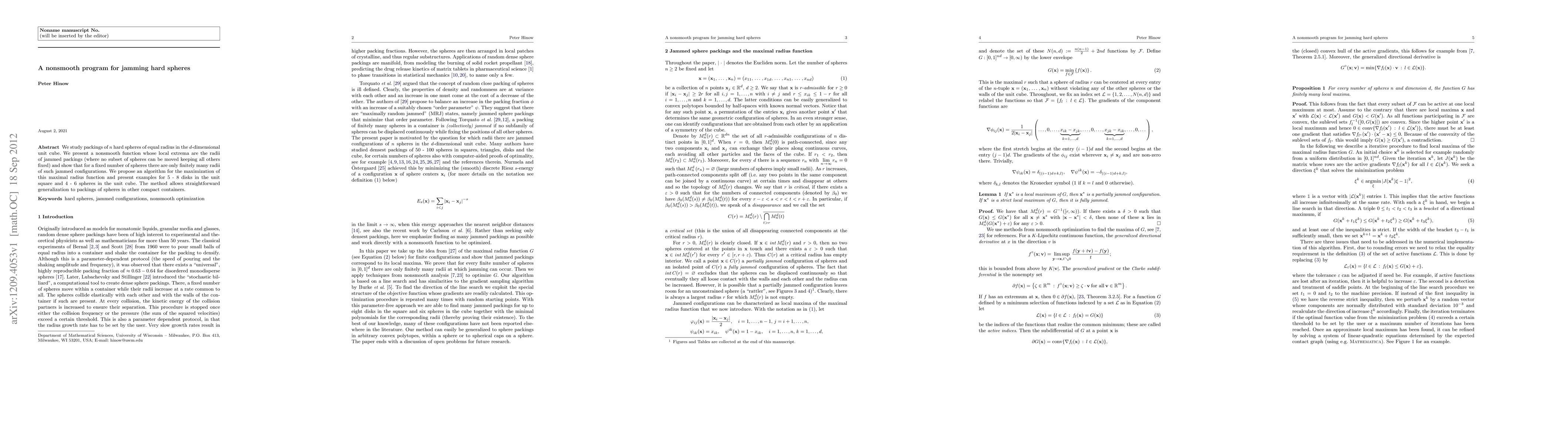 We study packings of $n$ hard spheres of equal radius in the $d$-dimensional unit cube. We present a nonsmooth function whose local extrema are the radii of jammed packings (where no subset of spheres can be moved keeping all others fixed) and show that for a fixed number of spheres there are only finitely many radii of such jammed configurations. We propose an algorithm for the maximization of this maximal radius function and present examples for 5 - 8 disks in the unit square and 4 - 6 spheres in the unit cube. The method allows straightforward generalization to packings of spheres in other compact containers.