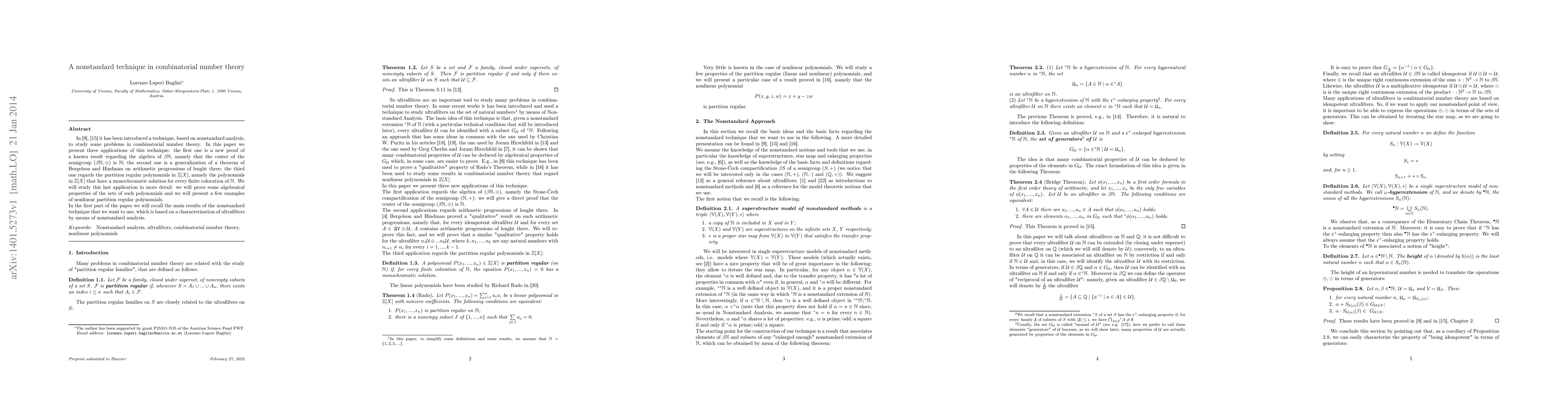 This paper applies a nonstandard analysis technique to combinatorial number theory, providing new proofs and generalizations, including a new proof for the center of the semigroup (\beta\mathbb{N};\oplus) being \mathbb{N}, a generalization of Bergelson and Hindman's theorem on arithmetic progressions, and exploring partition regular polynomials in Z[X] with detailed algebraic properties and examples.