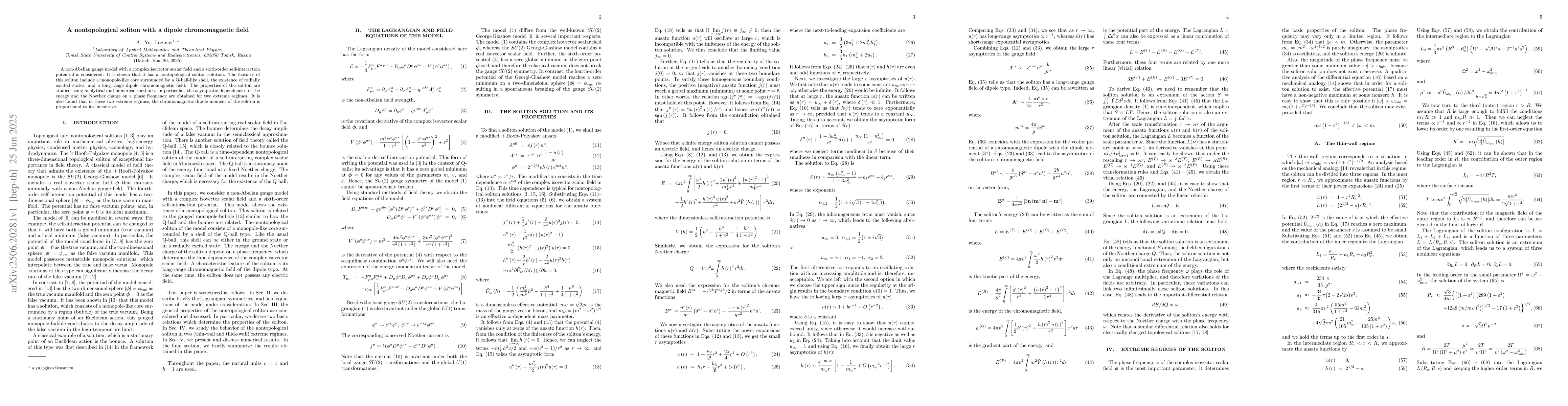 A non-Abelian gauge model with a complex isovector scalar field and a sixth-order self-interaction potential is considered. It is shown that it has a nontopological soliton solution. The features of this soliton include a monopole-like core surrounded by a Q-ball-like shell, the existence of radially excited states, and a long-range dipole chromomagnetic field. The properties of the soliton are studied using analytical and numerical methods. In particular, the asymptotic dependencies of the energy and the Noether charge on a phase frequency are obtained for two extreme regimes. It is also found that in these two extreme regimes, the chromomagnetic dipole moment of the soliton is proportional to its linear size.