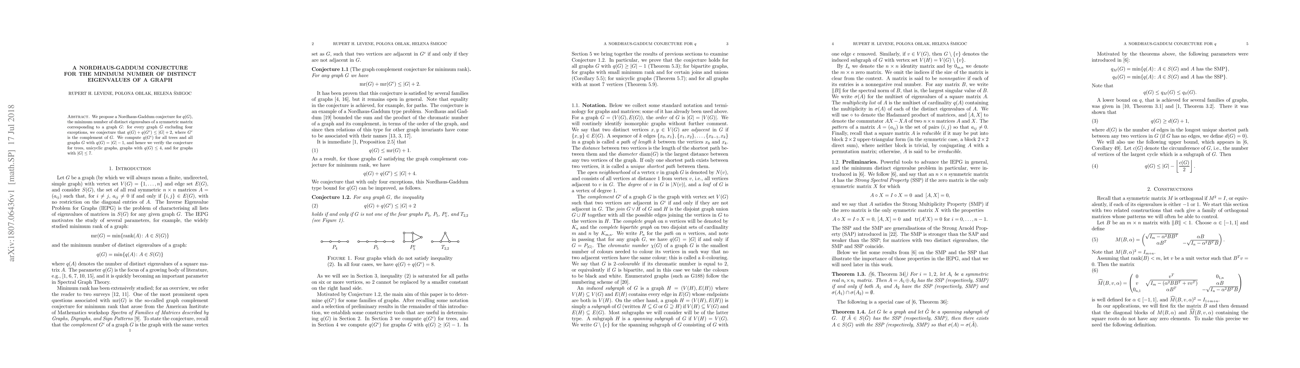 We propose a Nordhaus-Gaddum conjecture for $q(G)$, the minimum number of distinct eigenvalues of a symmetric matrix corresponding to a graph $G$: for every graph $G$ excluding four exceptions, we conjecture that $q(G)+q(G^c)\le |G|+2$, where $G^c$ is the complement of $G$. We compute $q(G^c)$ for all trees and all graphs $G$ with $q(G)=|G|-1$, and hence we verify the conjecture for trees, unicyclic graphs, graphs with $q(G)\le 4$, and for graphs with $|G|\le 7$.