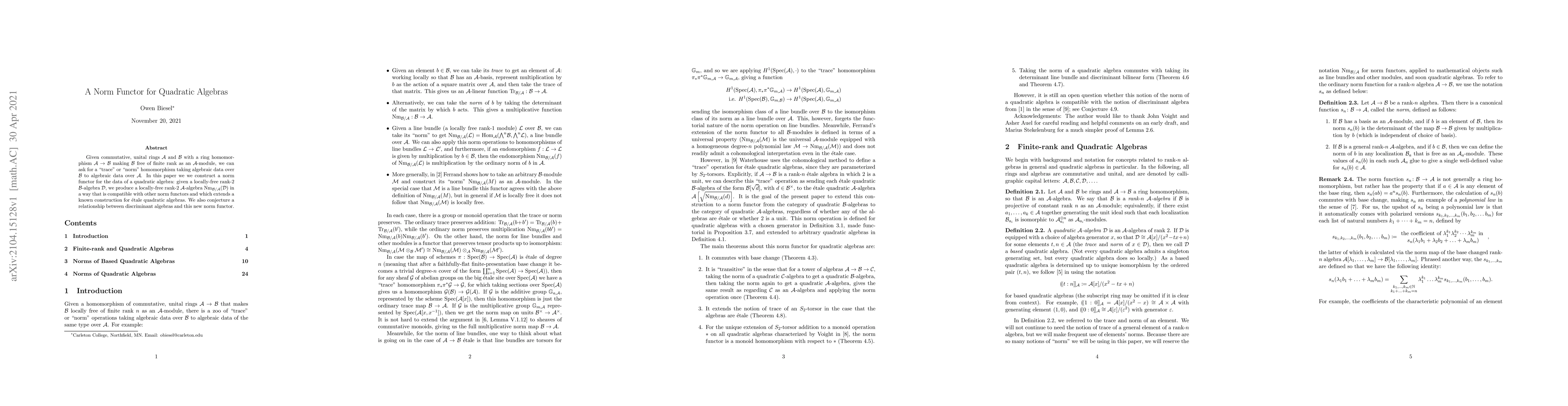 Given commutative, unital rings $A$ and $B$ with a ring homomorphism $A\to B$ making $B$ free of finite rank as an $A$-module, we can ask for a "trace" or "norm" homomorphism taking algebraic data over $B$ to algebraic data over $A$. In this paper we we construct a norm functor for the data of a quadratic algebra: given a locally-free rank-$2$ $B$-algebra $D$, we produce a locally-free rank-$2$ $A$-algebra $\mathrm{Nm}_{B/A}(D)$ in a way that is compatible with other norm functors and which extends a known construction for \'etale quadratic algebras. We also conjecture a relationship between discriminant algebras and this new norm functor.