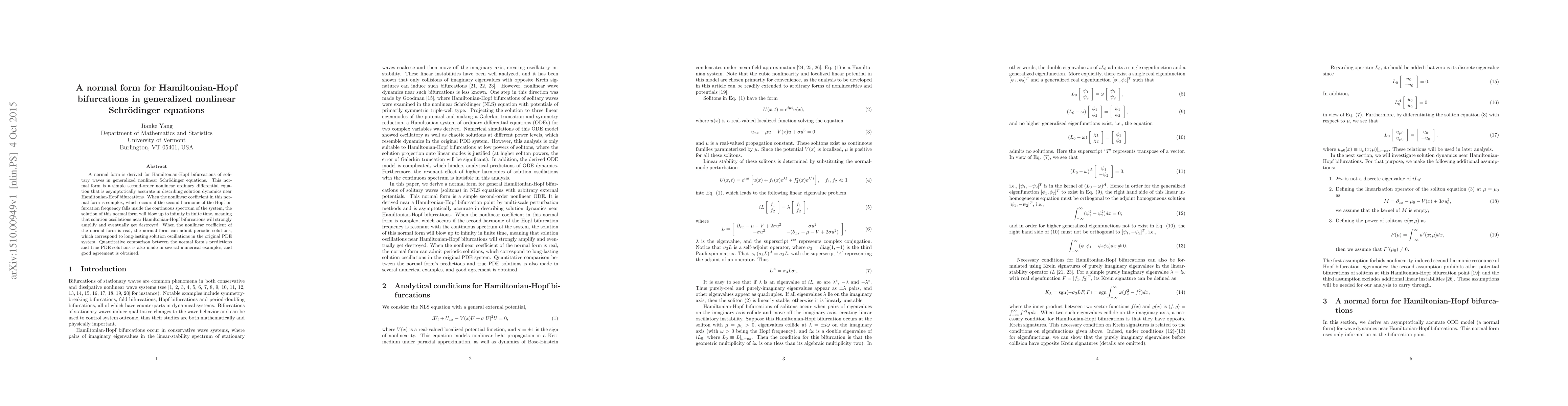 This paper derives a normal form for Hamiltonian-Hopf bifurcations in generalized nonlinear Schrödinger equations, showing that the normal form predicts strong amplification and eventual destruction of solutions when the nonlinear coefficient is complex, while it admits periodic solutions for real coefficients. Numerical comparisons confirm the normal form's accuracy.