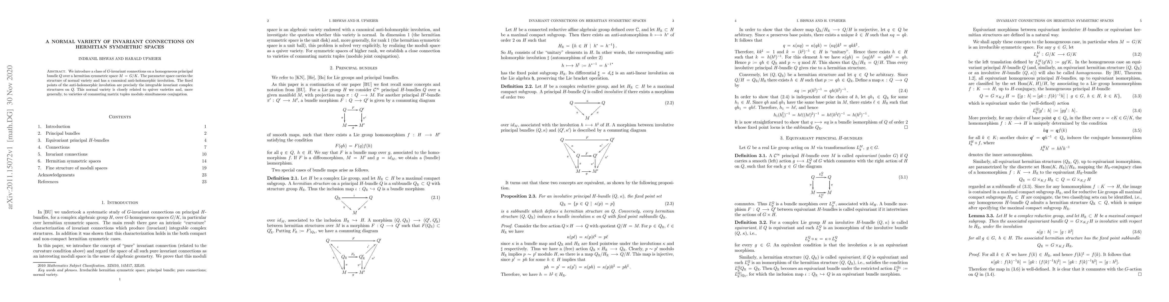 This paper introduces $G$-invariant connections on a homogeneous principal bundle over a hermitian symmetric space, showing that their parameter space forms a normal variety with an anti-holomorphic involution, whose fixed points correspond to integrable invariant complex structures. The study connects this normal variety to quiver varieties and commuting matrix tuples.