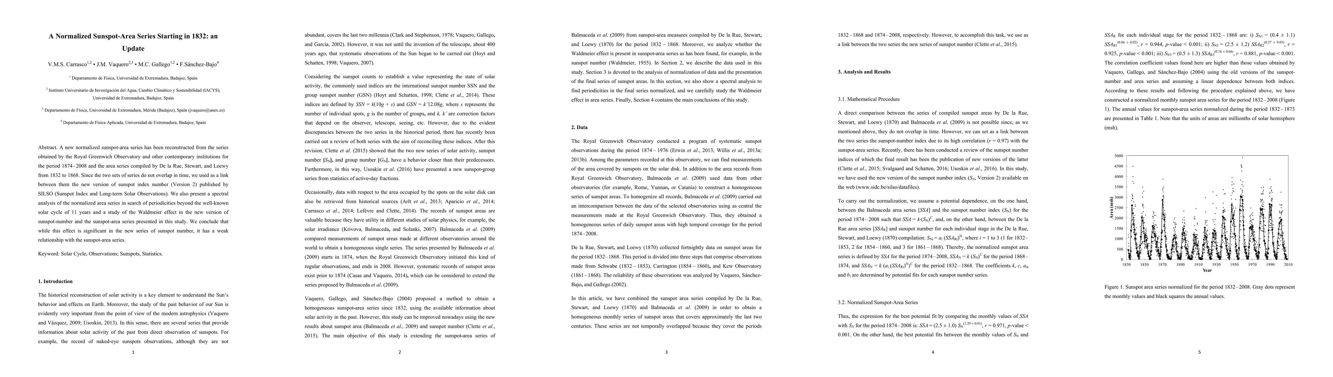 This paper reconstructs a normalized sunspot-area series from 1832 to 2008, linking historical data from De la Rue et al. and the Royal Greenwich Observatory using the SILSO sunspot index. It also examines periodicities beyond the 11-year solar cycle and finds a weak relationship between the Waldmeier effect and sunspot area.