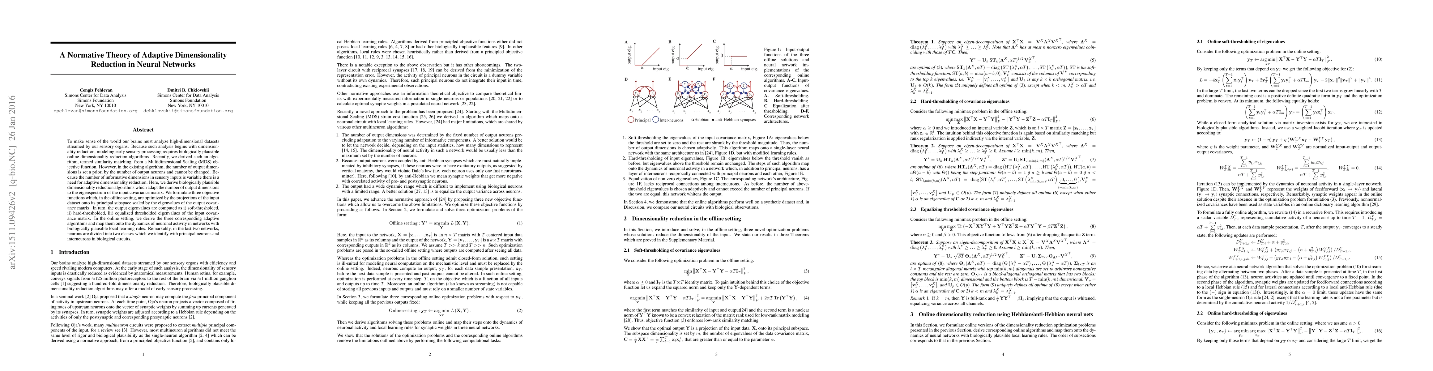 The paper presents a normative theory for adaptive dimensionality reduction in neural networks, derived from a Multidimensional Scaling (MDS) objective function, focusing on biologically plausible online algorithms.