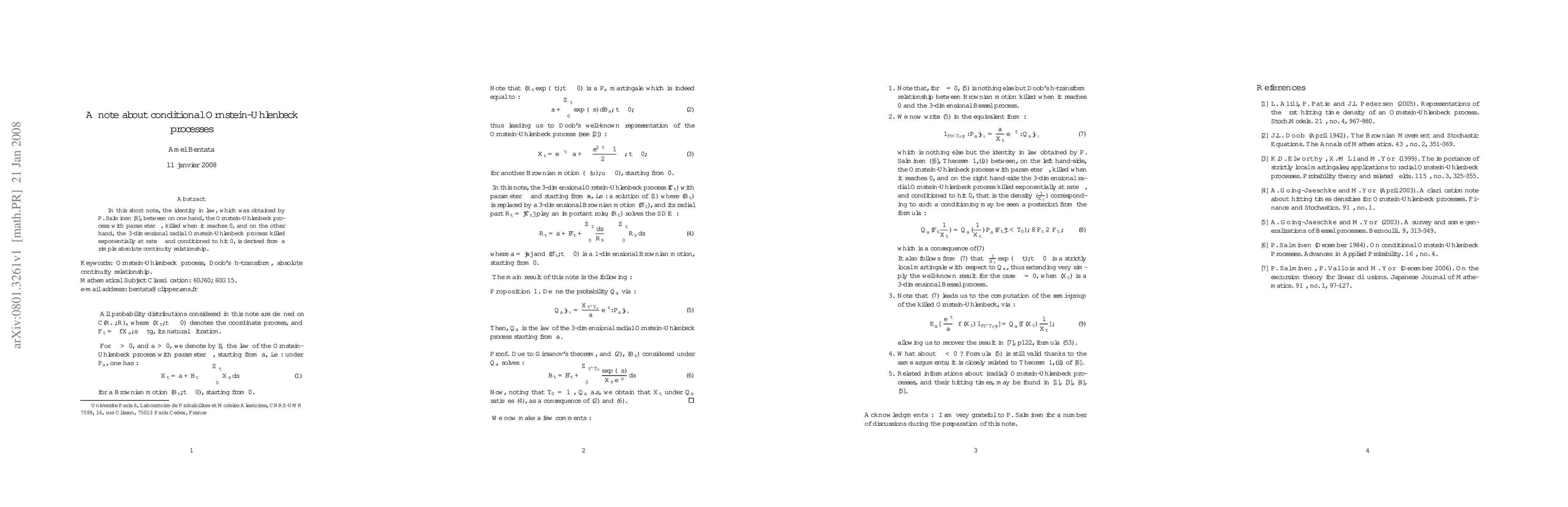 In this short note, the identity in law, which was obtained by P. Salminen, between on one hand, the Ornstein-Uhlenbeck process with parameter gamma, killed when it reaches 0, and on the other hand, the 3-dimensional radial Ornstein-Uhlenbeck process killed exponentially at rate gamma and conditioned to hit 0, is derived from a simple absolute continuity relationship.