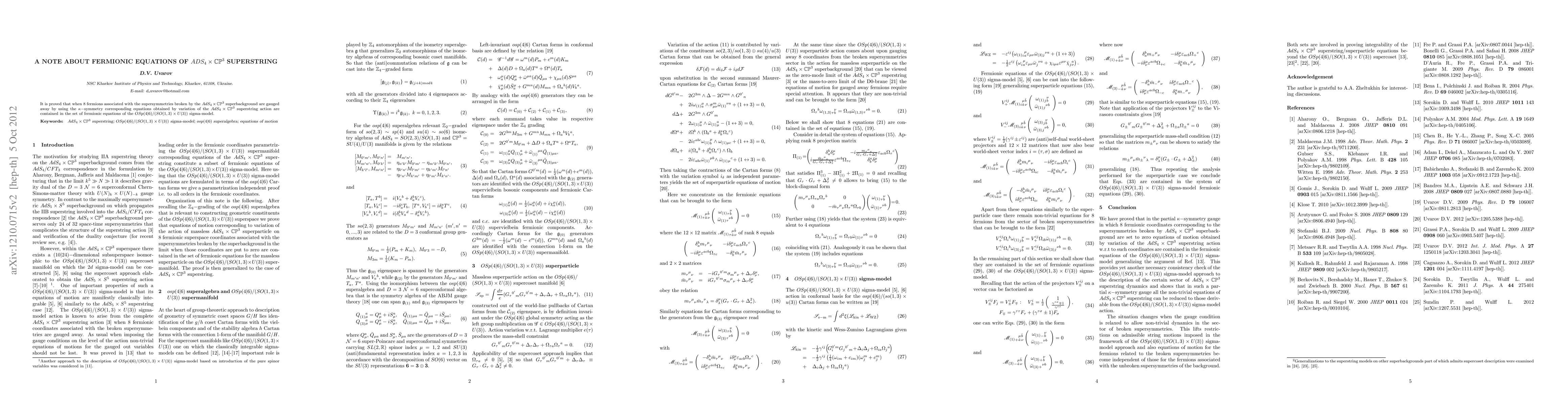 It is proved that when 8 fermions associated with the supersymmetries broken by the AdS_4 x CP^3 superbackground are gauged away by using the kappa-symmetry corresponding equations obtained by variation of the AdS_4 x CP^3 superstring action are contained in the set of fermionic equations of the OSp(4|6)/(SO(1,3) x U(3)) sigma-model.