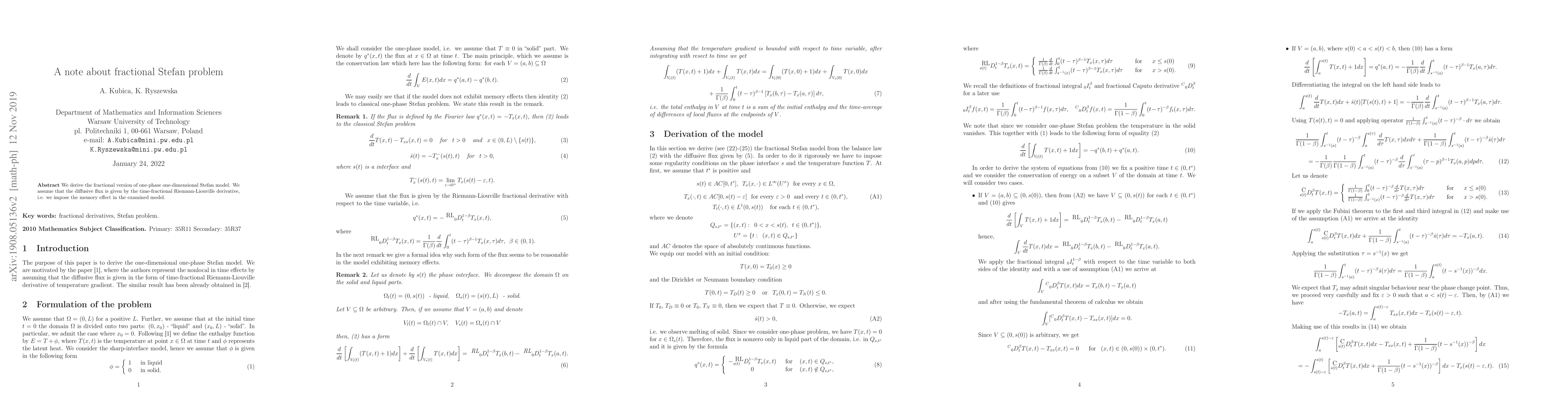 We derive the fractional version of one-phase one-dimensional Stefan model. We assume that the diffusive flux is given by the time-fractional Riemann-Liouville derivative, i.e. we impose the memory effect in the examined model.