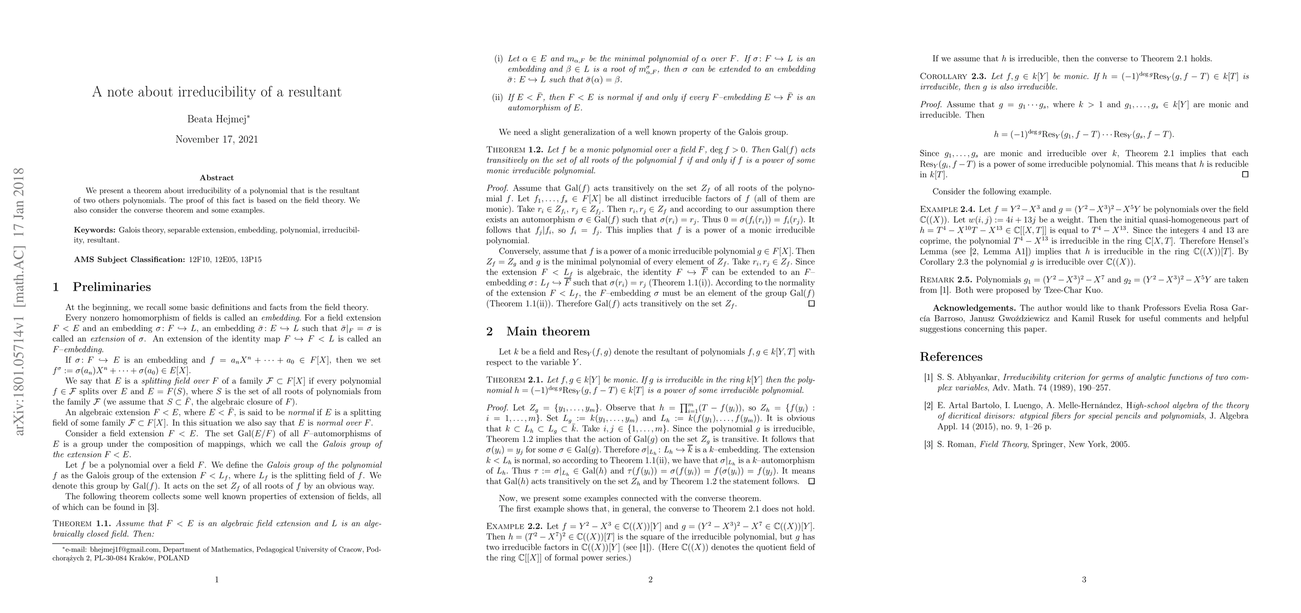 We present a theorem about irreducibility of a polynomial that is the resultant of two others polynomials. The proof of this fact is based on the field theory. We also consider the converse theorem and some examples.
