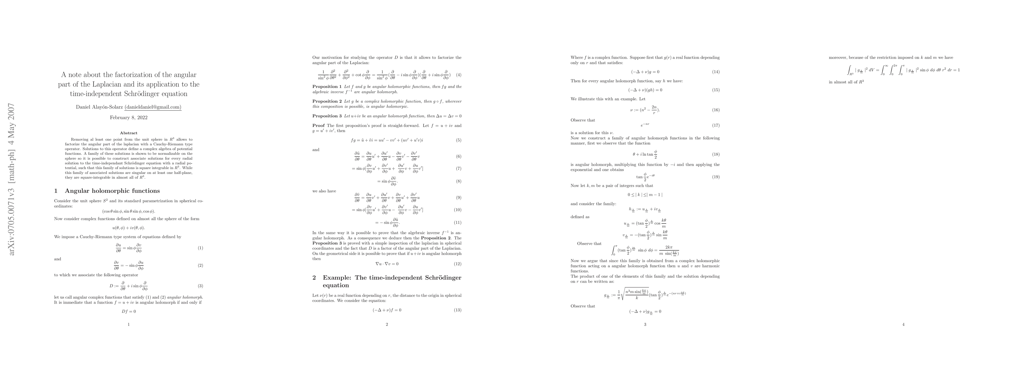 Removing al least one point from the unit sphere in $ R^{3}$ allows to factorize the angular part of the laplacian with a Cauchy-Riemann type operator. Solutions to this operator define a complex algebra of potential functions. A family of these solutions is shown to be normalizable on the sphere so it is possible to construct associate solutions for every radial solution to the time-independant Schr\"odinger equation with a radial potential, such that this family of solutions is square integrable in $R^{3}$. While this family of associated solutions are singular on at least one half-plane, they are square-integrable in almost all of $R^{3}$.