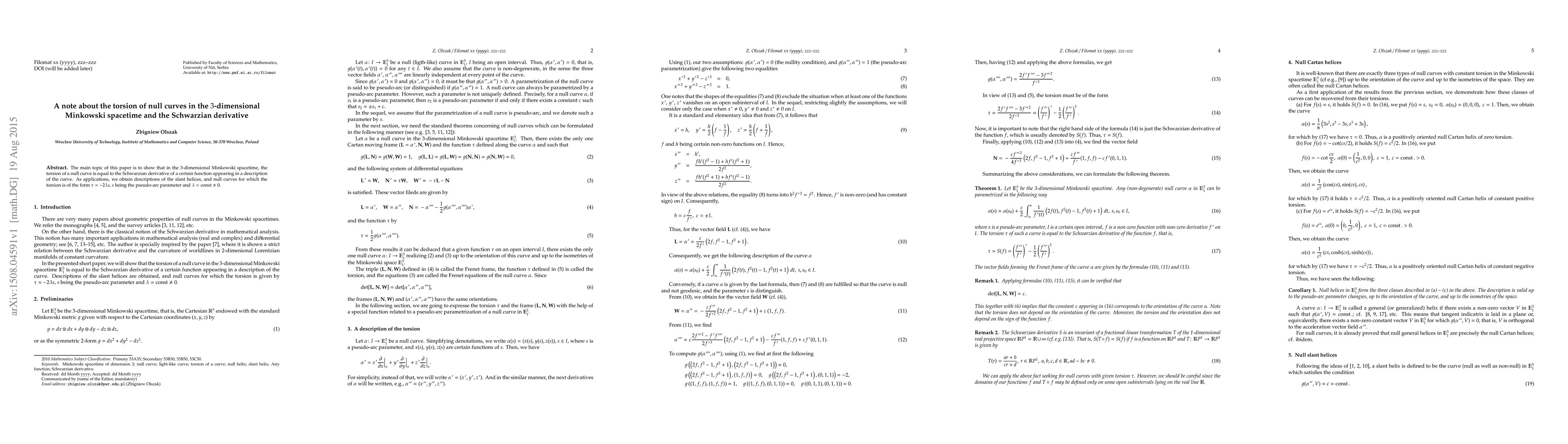 The main topic of this paper is to show that in the 3-dimensional Minkowski spacetime, the torsion of a null curve is equal to the Schwarzian derivative of a certain function appearing in a description of the curve. As applications, we obtain descriptions of the slant helices, and null curves for which the torsion is of the form $\tau=-2\lambda s$, $s$ being the pseudo-arc parameter and $\lambda=\mathop{\rm constant}\not=0$.