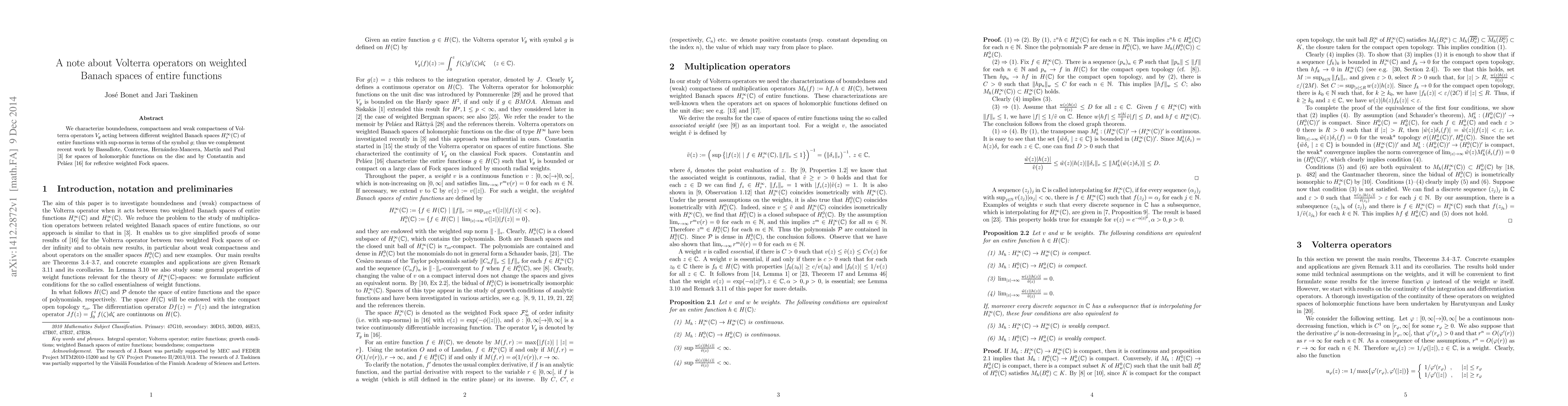 We characterize boundedness, compactness and weak compactness of Volterra operators acting between different weighted Banach spaces of entire functions with weighted sup-norms in terms of the symbol g. Thus we complement recent work by Bassallote, Contreras, Hern\'andez-Mancera, Mart\'in and Paul for spaces of holomorphic functions on the disc and by Constantin and Pel\'aez for reflexive weighted Fock spaces.