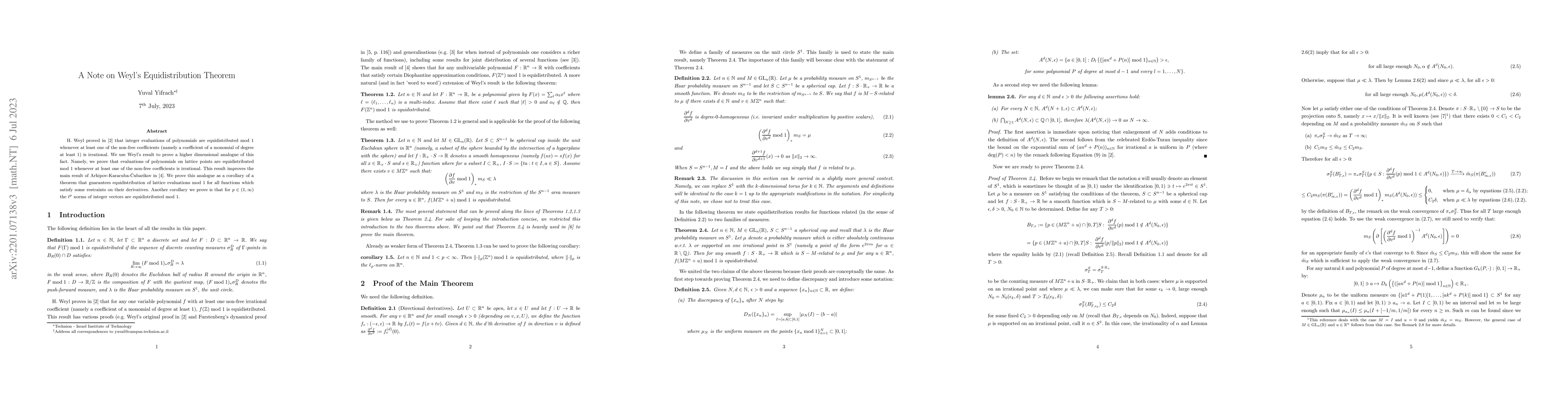Summary: Weyl's theorem on equidistribution of integer evaluations of polynomials is extended to higher dimensions, proving that lattice points evaluated by such polynomials are equidistributed mod 1 when at least one coefficient is irrational. This strengthens a related result and also shows equidistribution of $\ell^p$ norms of integer vectors mod 1 for $p\in(1,\infty)$.