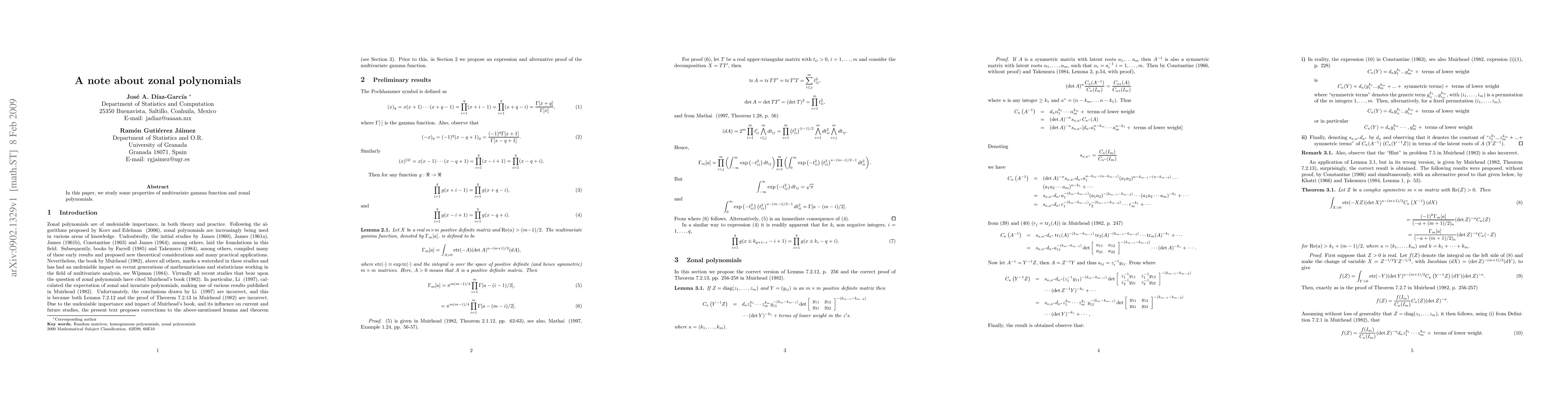 Summary: This paper explores the characteristics of multivariate gamma functions and examines zonal polynomials, focusing on their properties and potential applications.