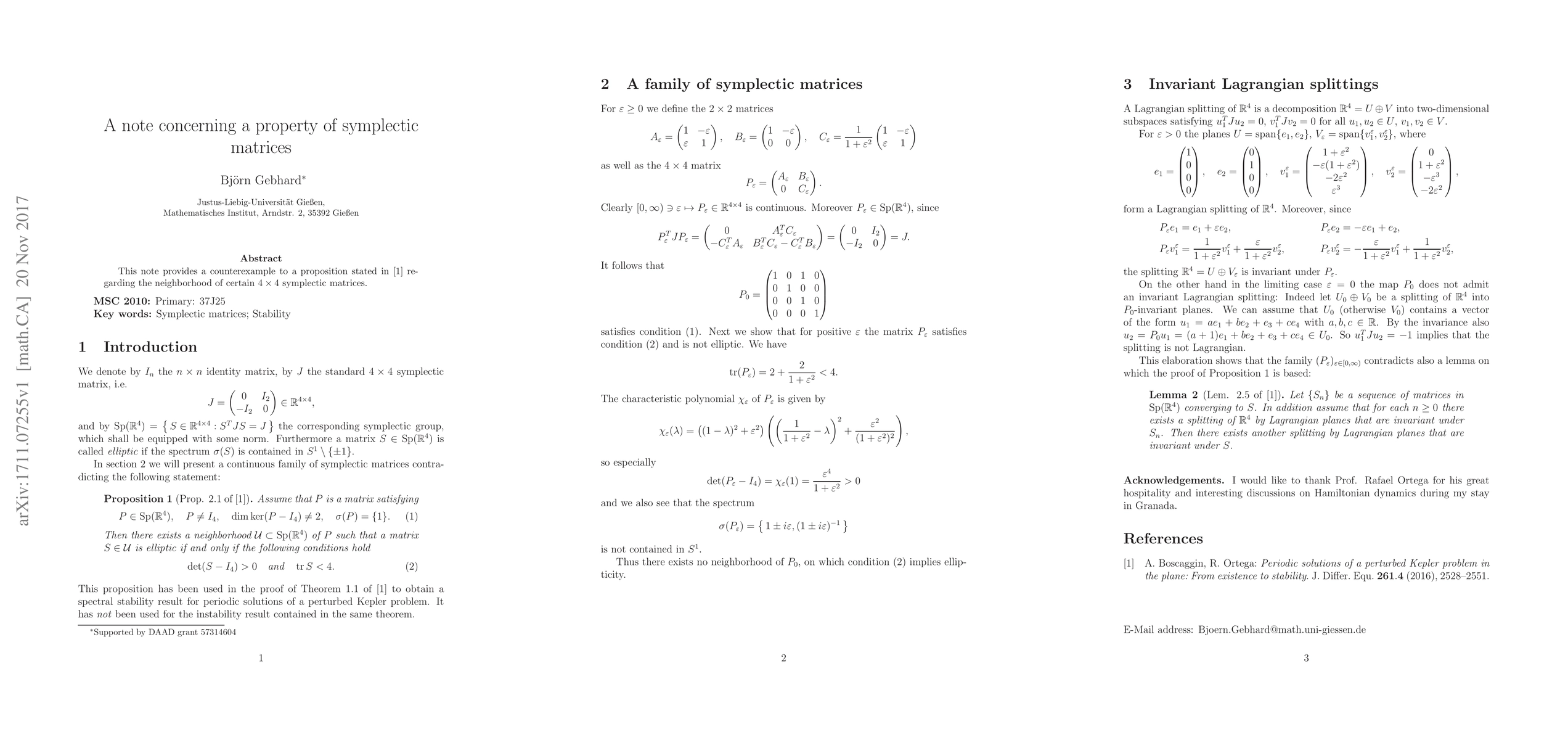 This note provides a counterexample to a proposition stated in [J. Differ. Equ. 261.4 (2016) 2528--2551] regarding the neighborhood of certain $4\times 4$ symplectic matrices.