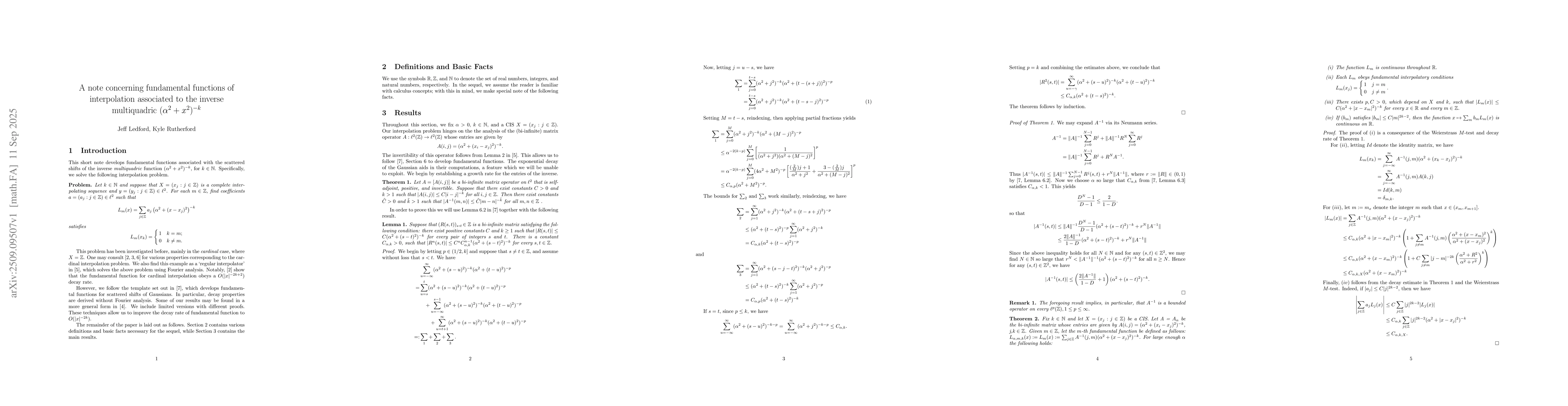 This short note develops fundamental functions associated with the scattered shifts of the inverse \emph{multiquadric} function $(\alpha^2 + x^2)^{-k}$, for $k\in\mathbb{N}$.