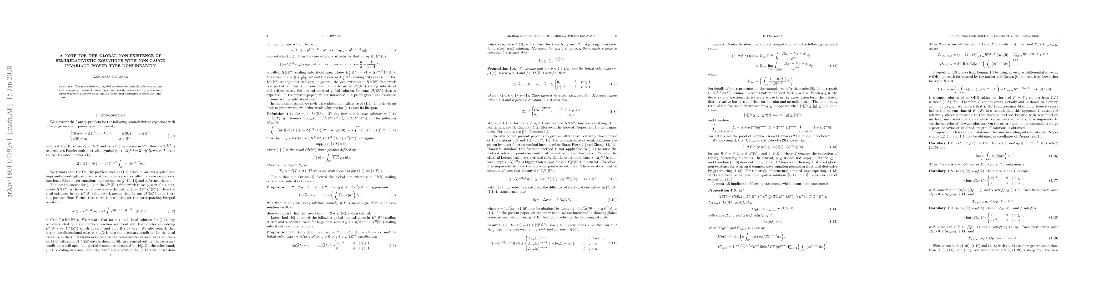The non-existence of global solutions for semirelativistic equations with non-gauge invariant power type nonlinearity is revisited by a relatively direct way with a pointwise estimate of fractional derivative of some test functions.