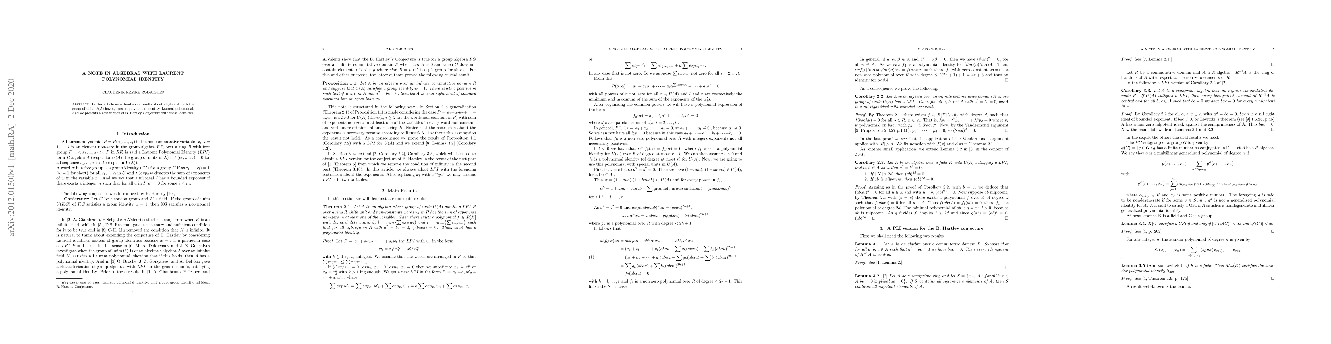 In this article, we extend some results about algebra $A$ with the group of units $U(A)$ having a special polynomial identity, Laurent polynomial. And we present a new version of B. Hartley Conjecture with these identities.