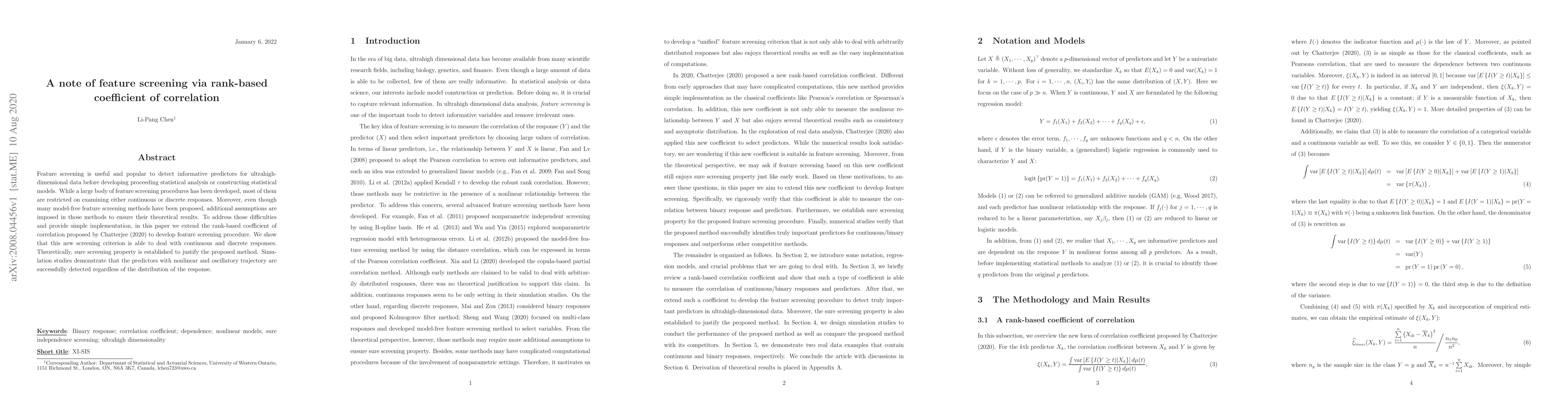 This paper extends the rank-based coefficient of correlation to develop a new feature screening method for ultrahigh-dimensional data, capable of handling both continuous and discrete responses without imposing additional assumptions. The proposed method demonstrates successful detection of informative predictors in simulation studies.