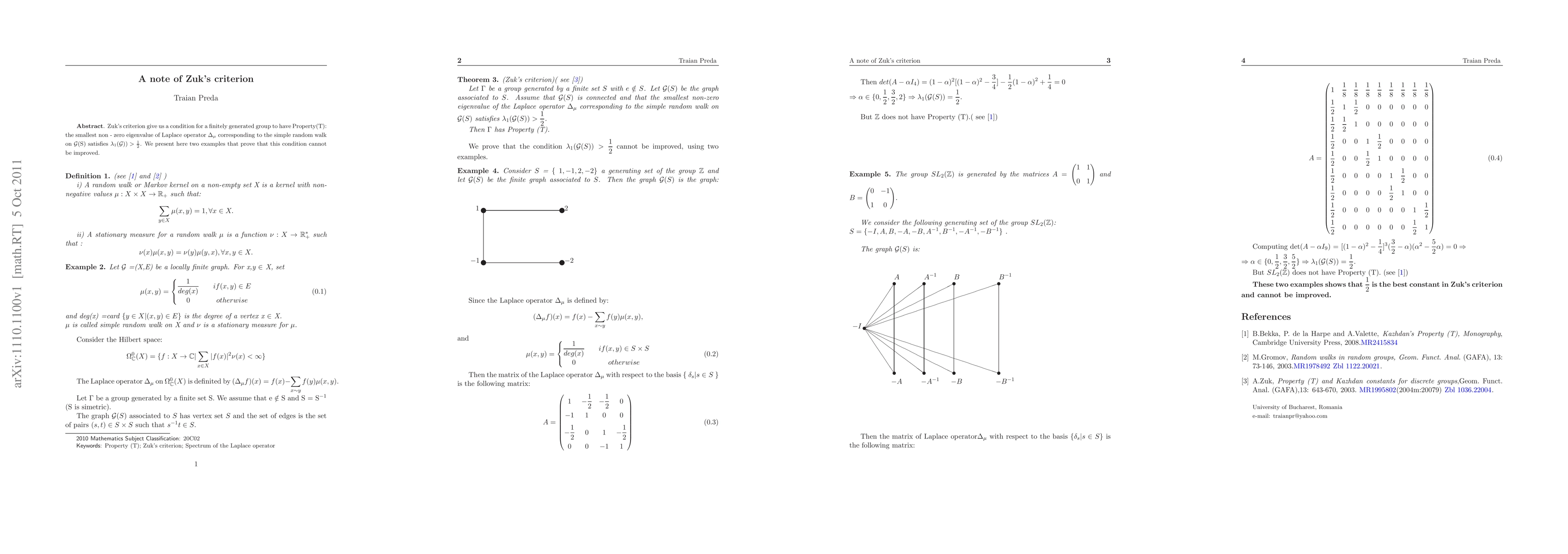 Zuk's criterion give us a condition for a finitely generated group to have Property(T): the smallest non - zero eigenvalue of Laplace operator corresponding to the simple random walk on the associated graph have to be greater than 1/2. We present here two examples that prove that this condition cannot be improved.