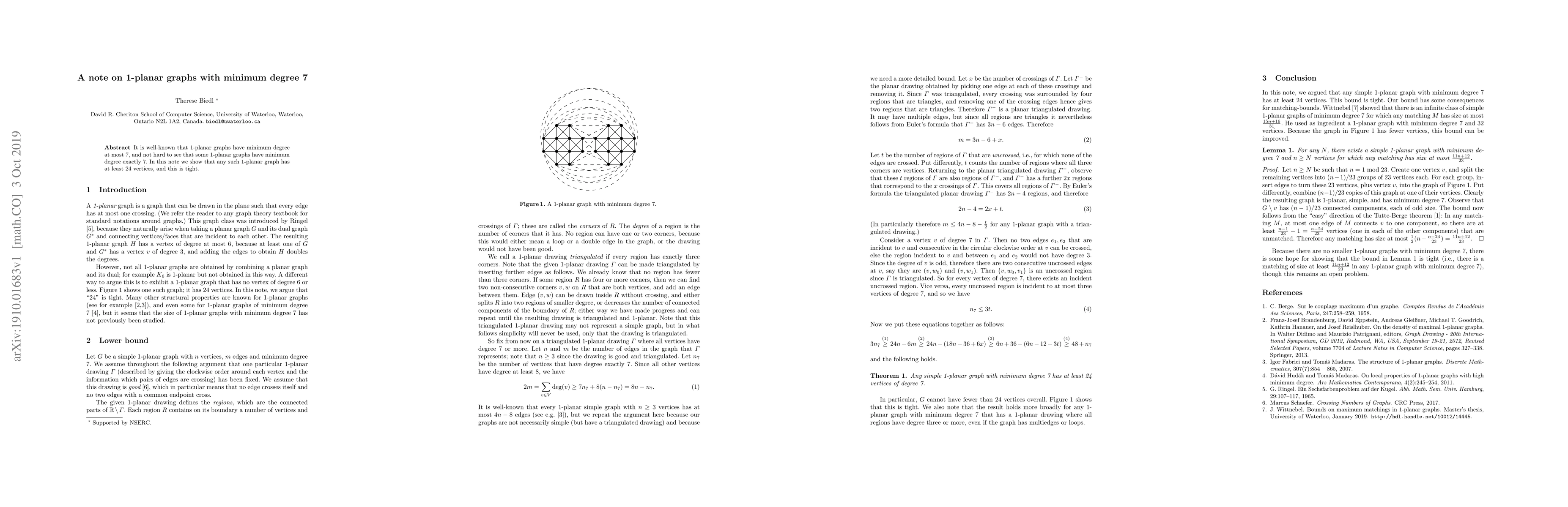 Summary: This note establishes that any 1-planar graph with a minimum degree of exactly 7 must contain at least 24 vertices, with an example provided to show this bound is achievable.
