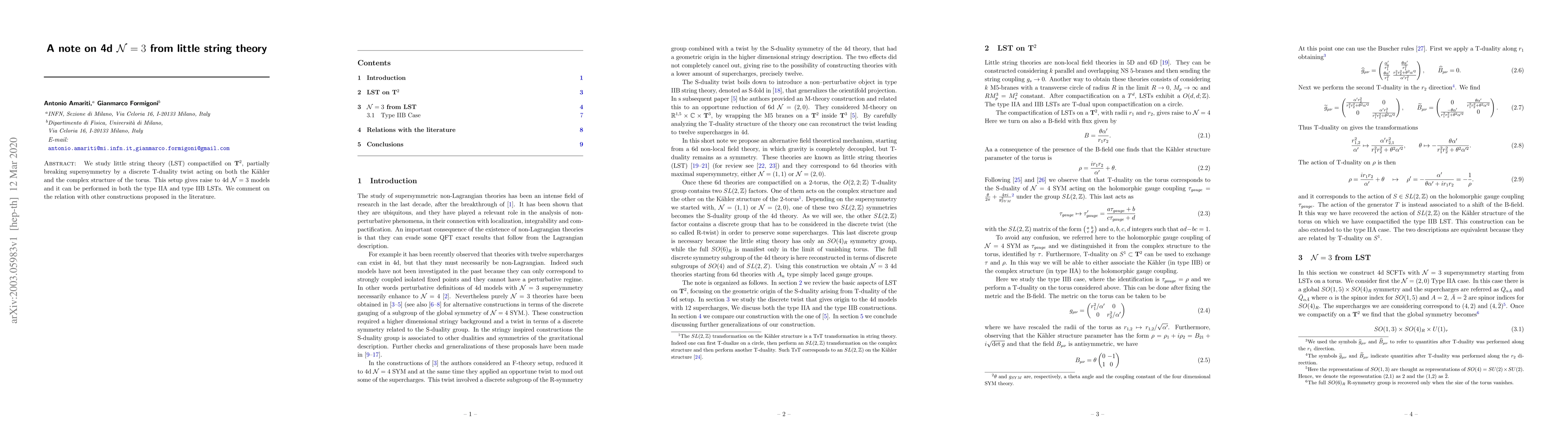 This paper explores little string theory compactified on a two-torus, inducing 4d $\mathcal{N}=3$ supersymmetry through a discrete T-duality twist. It discusses the implications for both type IIA and type IIB LSTs and compares the results with other similar constructions in the literature.