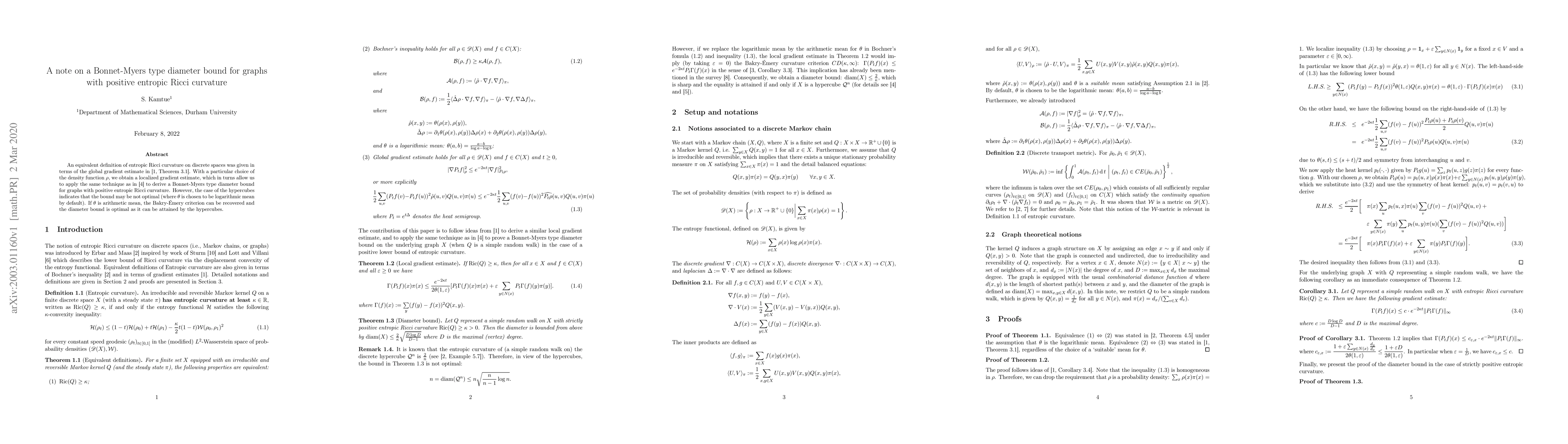 An equivalent definition of entropic Ricci curvature on discrete spaces was given in terms of the global gradient estimate. With a particular choice of the density function $\rho$, we obtain a localized gradient estimate, which in turns allow us to derive a Bonnet-Myers type diameter bound for graphs with positive entropic Ricci curvature. However, the case of the hypercubes indicates that the bound may be not optimal (where $\theta$ is chosen to be logarithmic mean by default). If $\theta$ is arithmetic mean, the Bakry-\'Emery criterion can be recovered and the diameter bound is optimal as it can be attained by the hypercubes.