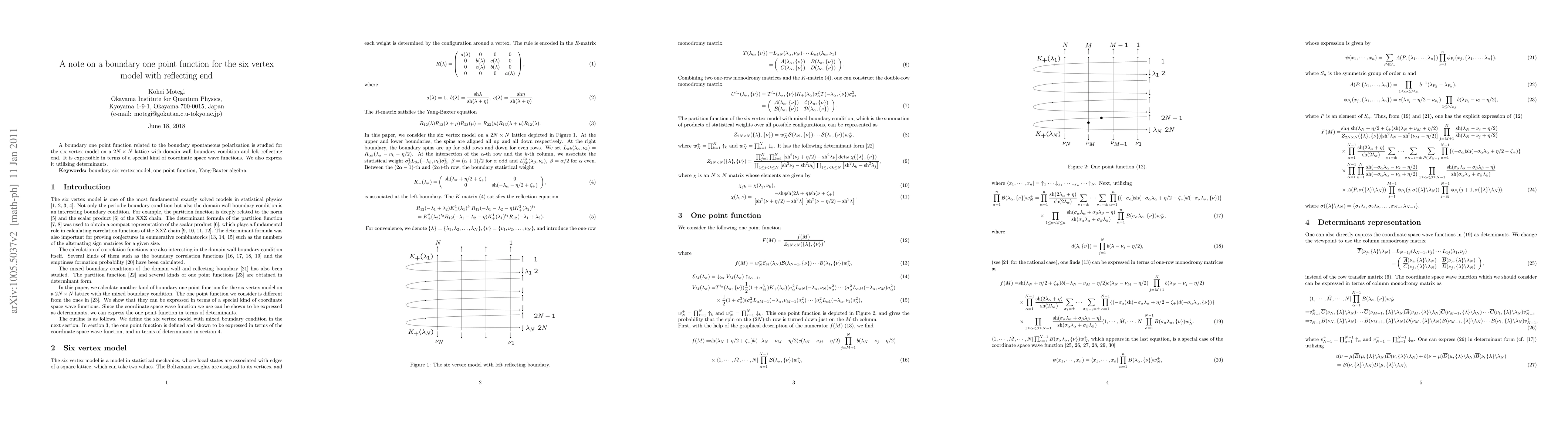 Summary: This paper investigates a novel boundary one point function for the six vertex model with reflecting end conditions, focusing on a 2N × N lattice with domain wall boundaries. The function is expressed in terms of determinant-based coordinate space wave functions, offering a new perspective on boundary spontaneous polarization.