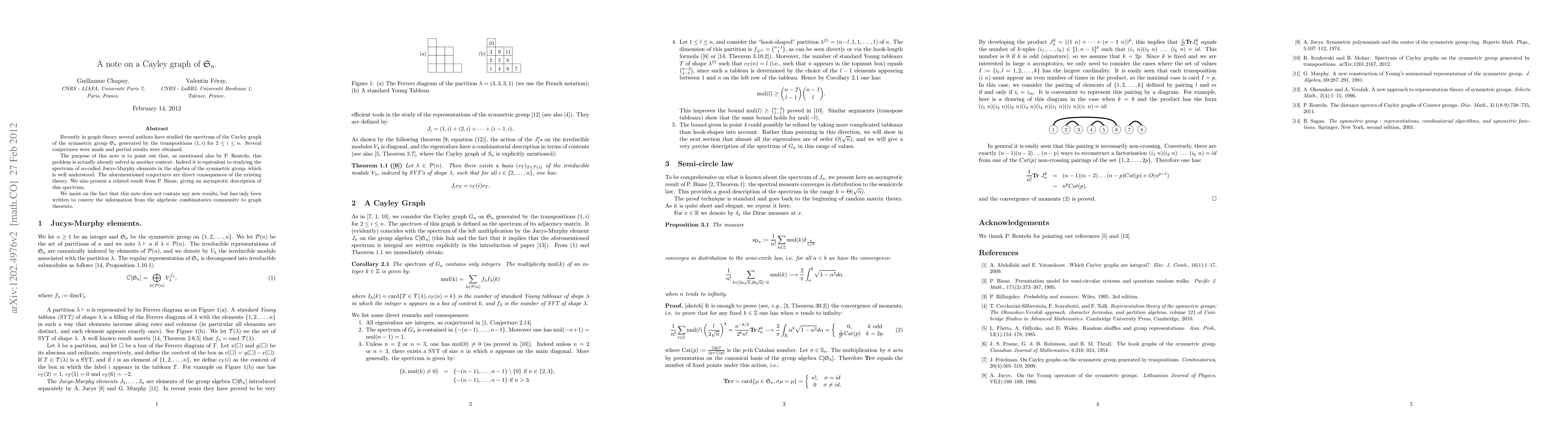 Recently in graph theory several authors have studied the spectrum of the Cayley graph of the symmetric group S_n generated by the transpositions (1, i) for 2 <= i <= n. Several conjectures were made and partial results were obtained. The purpose of this note is to point out that, as mentioned also by P. Renteln, this problem is actually already solved in another context. Indeed it is equivalent to studying the spectrum of so-called Jucys-Murphy elements in the algebra of the symmetric group, which is well understood. The aforementioned conjectures are direct consequences of the existing theory. We also present a related result from P. Biane, giving an asymptotic description of this spectrum. We insist on the fact that this note does not contain any new results, but has only been written to convey the information from the algebraic combinatorics community to graph theorists.