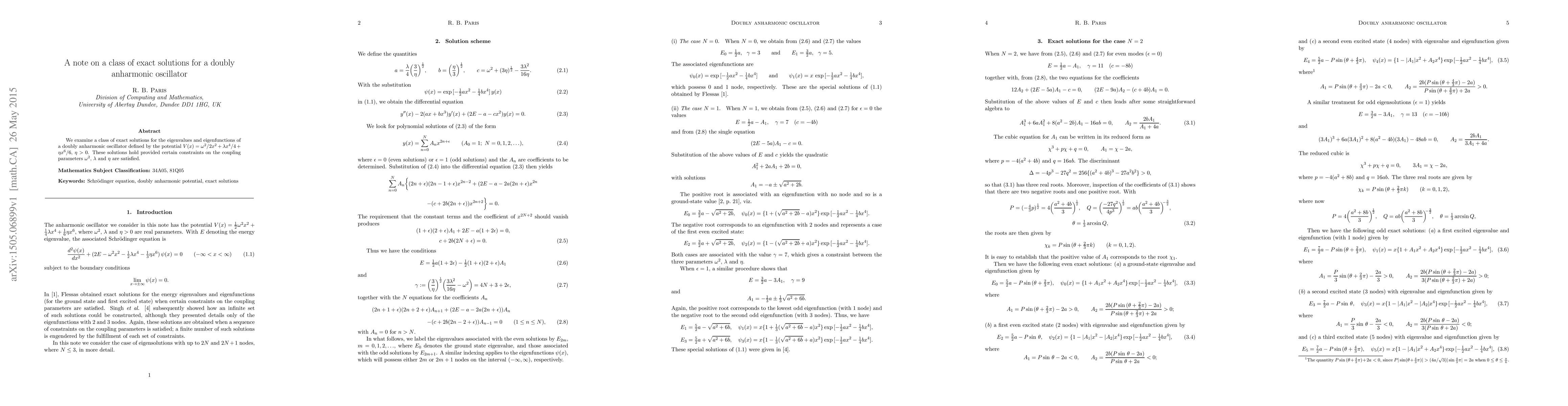 Researchers found exact solutions for a doubly anharmonic oscillator with specific constraints on coupling parameters $eta$, $ heta$ and $ au$ satisfying the potential $V(x)=rac{eta^2}{2}x^2+rac{ heta x^4}{4}+rac{ au x^6}{6}$.