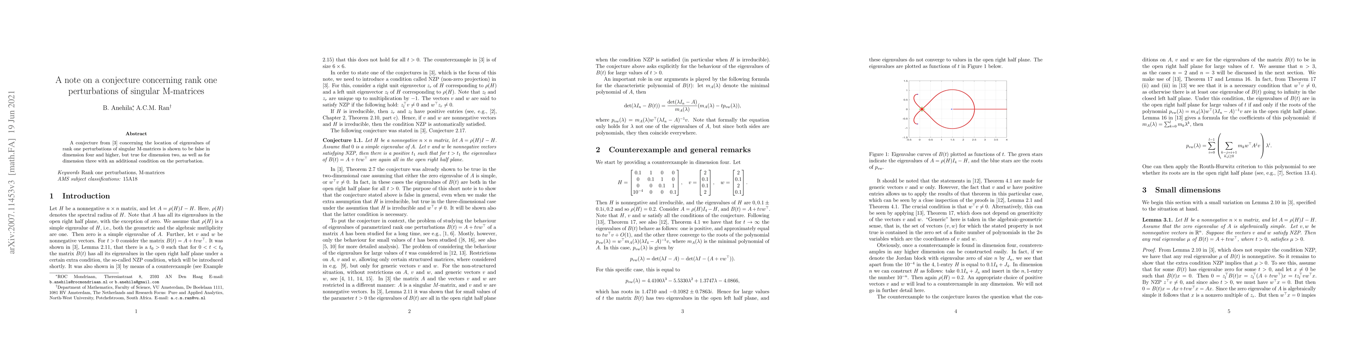A conjecture from a paper by J. Bierkens and A.C.M. Ran concerning the location of eigenvalues of rank one perturbations of singular M-matrices is shown to be false in dimension four and higher, but true for dimension two, as well as for dimension three with an additional condition on the perturbation.