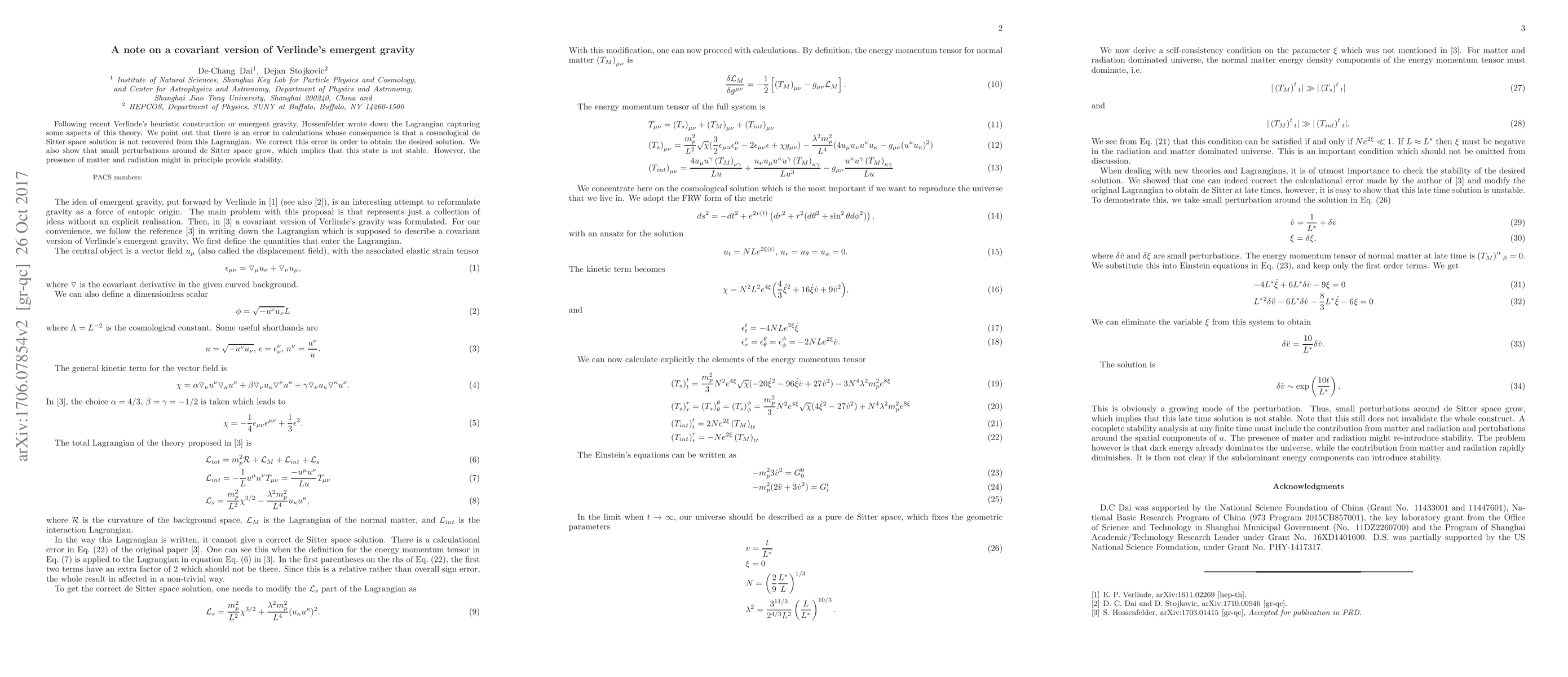 Following recent Verlinde's heuristic construction or emergent gravity, Hossenfelder wrote down the Lagrangian capturing some aspects of this theory. We point out that there is an error in calculations whose consequence is that a cosmological de Sitter space solution is not recovered from this Lagrangian. We correct this error in order to obtain the desired solution. We also show that small perturbations around de Sitter space grow, which implies that this state is not stable. However, the presence of matter and radiation might in principle provide stability.