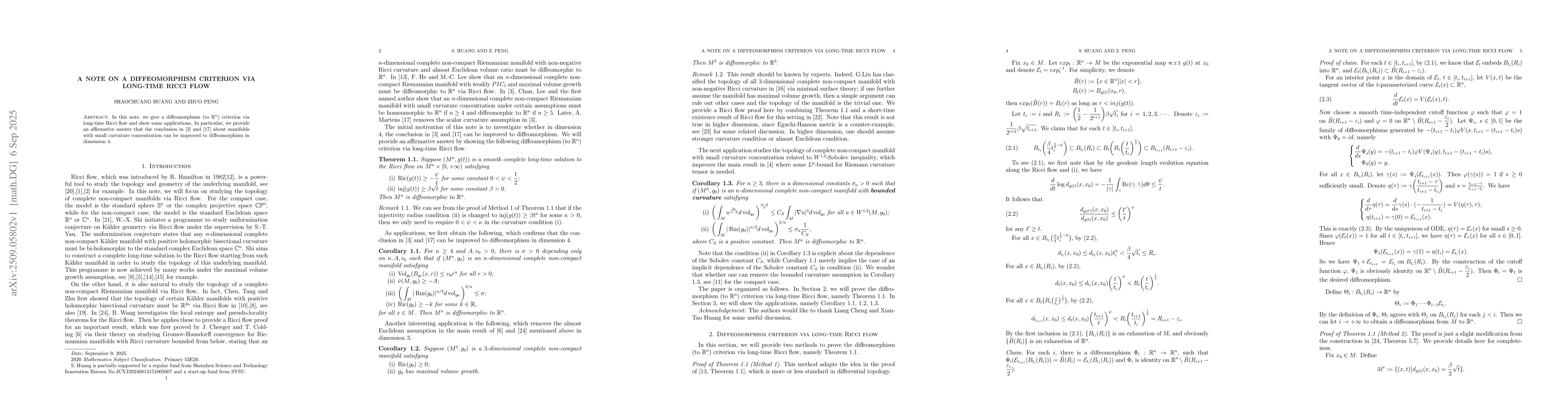 In this note, we give a diffeomorphism (to $\mathbb{R}^n$) criterion via long-time Ricci flow and show some applications. In particular, we provide an affirmative answer that the conclusion in [Manifolds with small curvature concentration, Ann. PDE, 2024] by Chan, Lee and the first named author and [Removing scalar curvature assumption for Ricci flow smoothing, Bull. Lond. Math. Soc., 2025] by A. Martens about manifolds with small curvature concentration can be improved to diffeomorphism in dimension $4$.