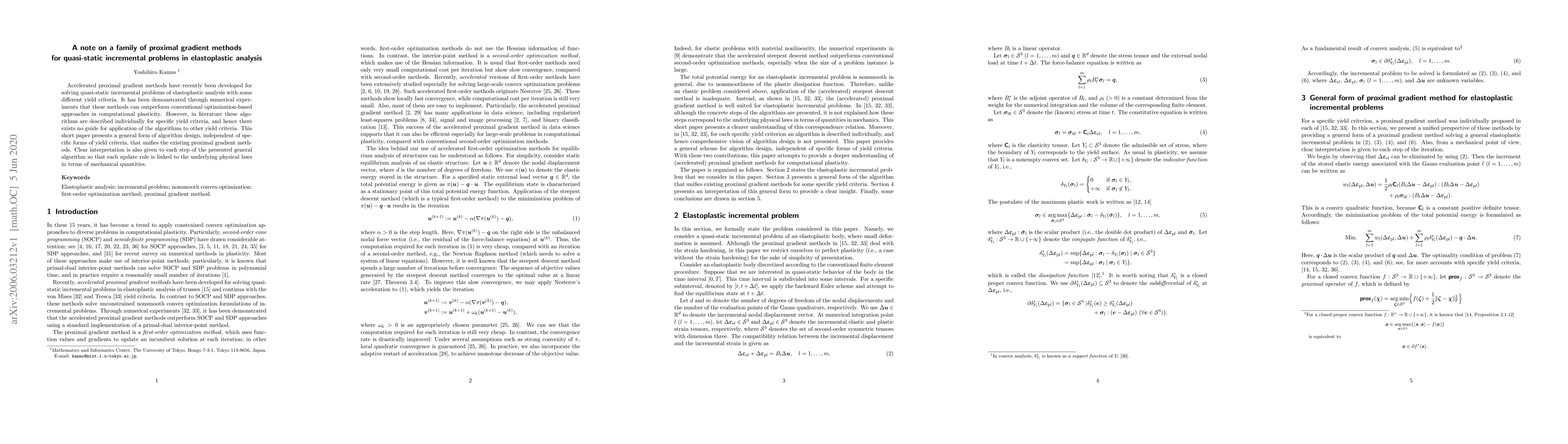 This paper introduces a unified proximal gradient method for solving quasi-static incremental problems in elastoplastic analysis, transcending specific yield criteria. It provides clear interpretations of each step, linking update rules to underlying physical laws in mechanical terms.