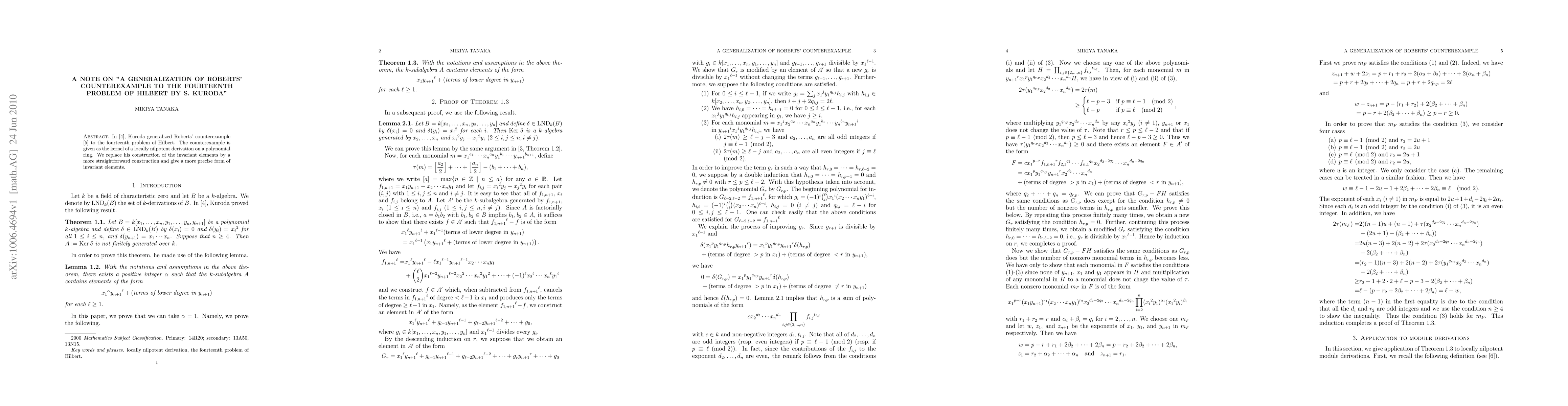 In [4], Kuroda generalized Roberts' counterexample \cite{Roberts} to the fourteenth problem of Hilbert. The counterexample is given as the kernel of a locally nilpotent derivation on a polynomial ring. We replace his construction of the invariant elements by a more straightforward construction and give a more precise form of invariant elements.
