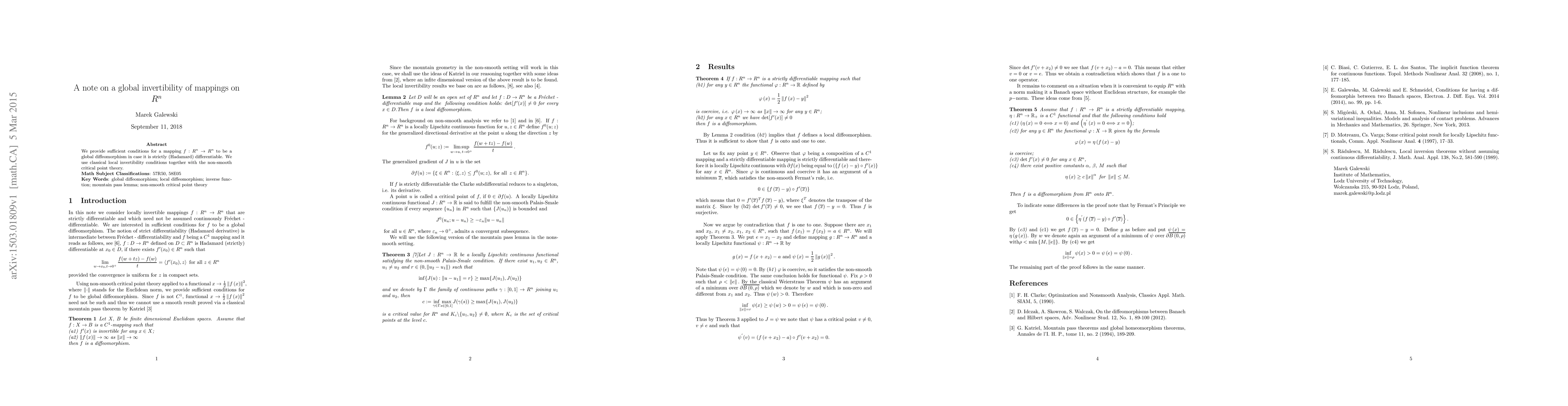 We provide sufficient conditions for a mapping $f:R^{n}\rightarrow R^{n}$ to be a global diffeomorphism in case it is strictly (Hadamard) differentiable. We use classical local invertibility conditions together with the non-smooth critical point theory.