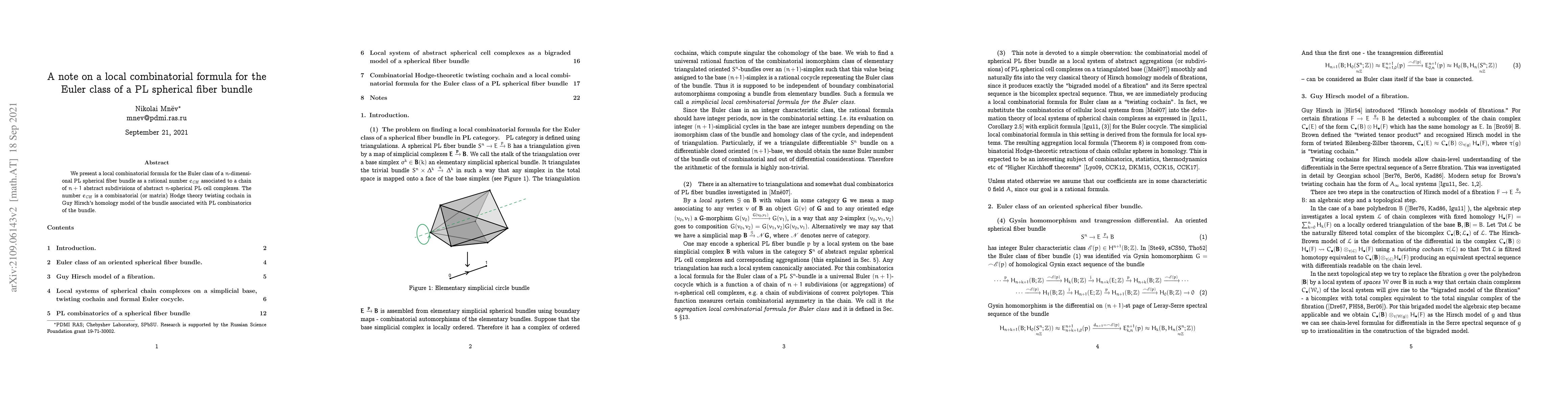 Summary: This paper introduces a local combinatorial formula for the Euler class of $n$-dimensional PL spherical fiber bundles, expressed as a rational number $e_{\it CH}$ derived from a chain of $n+1$ abstract subdivisions of $n$-spherical PL cell complexes, serving as a combinatorial Hodge theory twisting cochain in Hirsch's homology model.