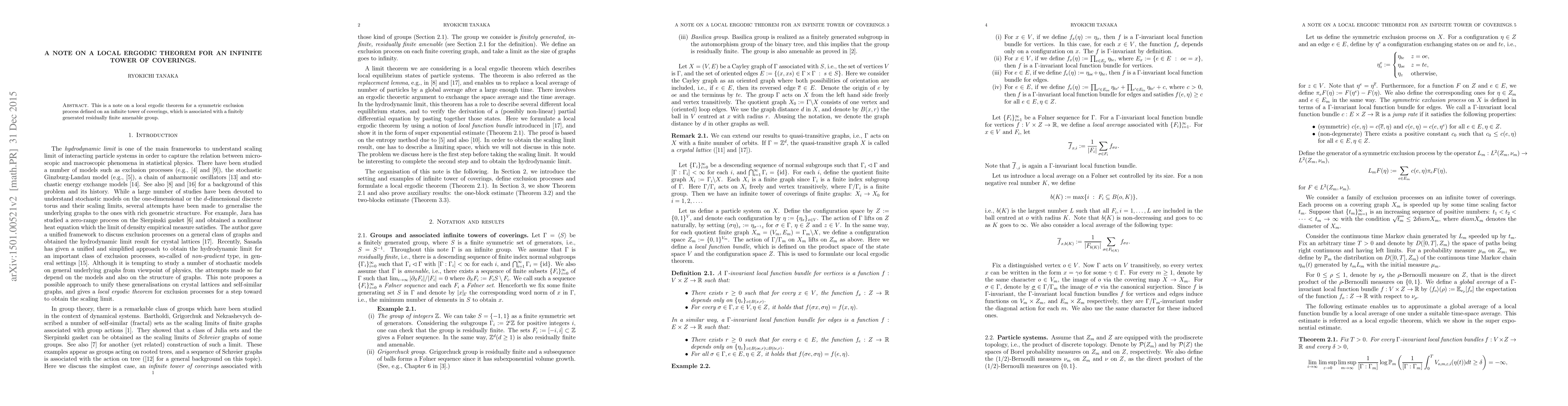 Summary: This paper presents a local ergodic theorem for a symmetric exclusion process on an infinite tower of coverings linked to a finitely generated residually finite amenable group, providing insights into the dynamics of the system.