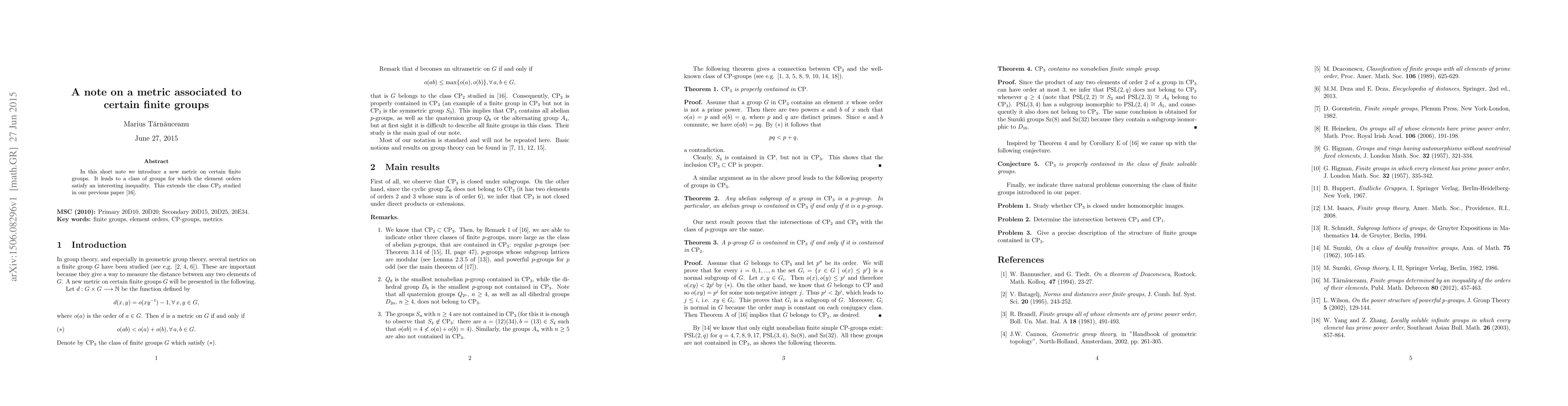Summary: This paper introduces a novel metric on specific finite groups, revealing an intriguing inequality among element orders. This extends the previously studied CP_2 class from the authors' earlier work.