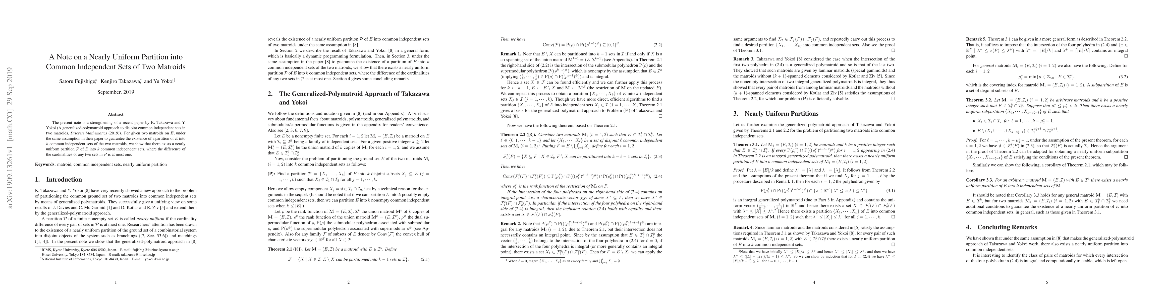 This research paper improves upon a previous result to show that for two given matroids on E, there exists a nearly uniform partition into k common independent sets, where the difference in cardinality between any two sets is at most one.