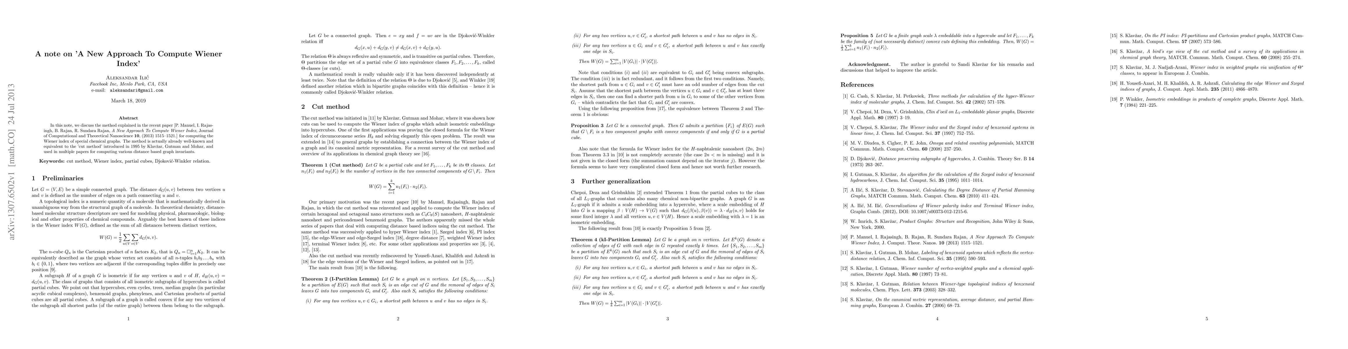 In this note, we discuss the method explained in the recent paper [P. Manuel, I. Rajasingh, B. Rajan, R. Sundara Rajan, A New Approach To Compute Wiener Index, Journal of Computational and Theoretical Nanoscience 10, (2013) 1515-1521.] for computing the Wiener index of special chemical graphs. The method is actually already well-known and equivalent to the 'cut method' introduced in 1995 by Klavzar, Gutman and Mohar, and used in multiple papers for computing various distance based graph invariants.