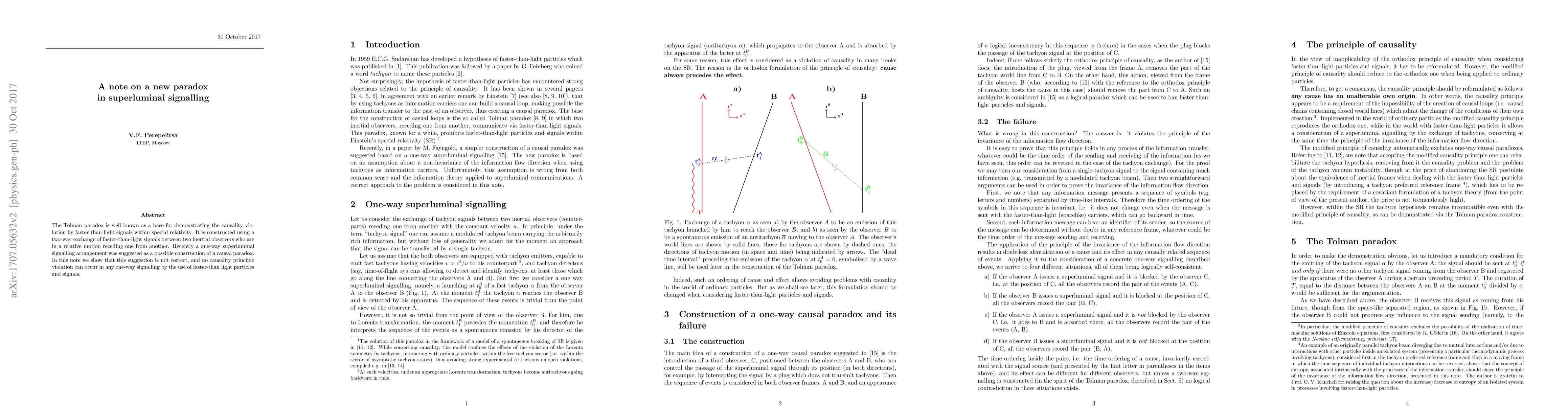 This paper addresses a proposed one-way superluminal signalling paradox, demonstrating that such signalling does not violate causality principles, unlike the Tolman paradox involving two-way exchanges of faster-than-light signals. It concludes that no causality violation can occur with one-way superluminal signalling.