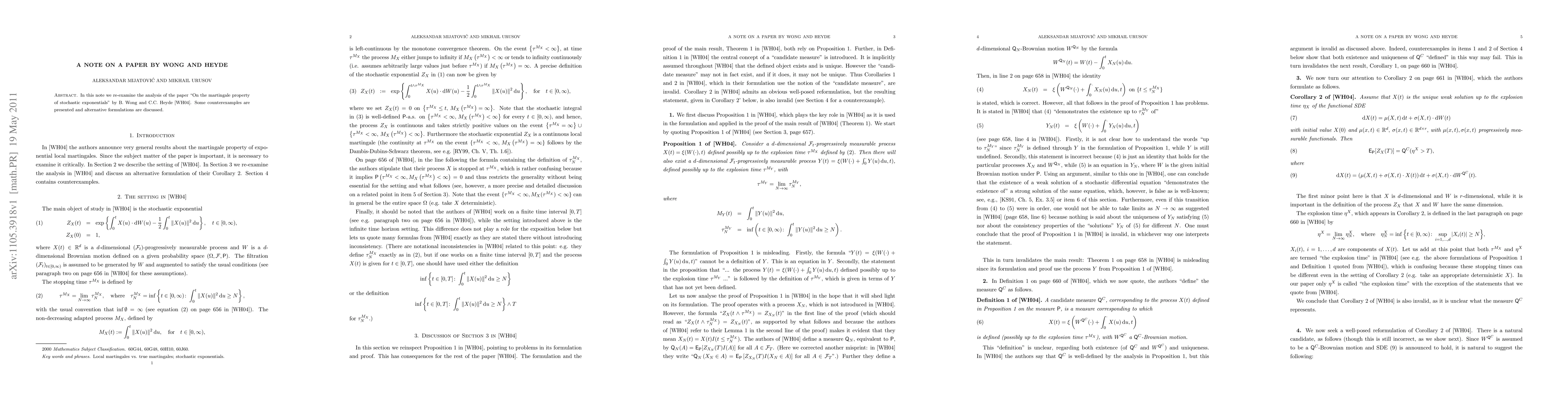 In this note we re-examine the analysis of the paper "On the martingale property of stochastic exponentials" by B. Wong and C.C. Heyde, Journal of Applied Probability, 41(3):654-664, 2004. Some counterexamples are presented and alternative formulations are discussed.
