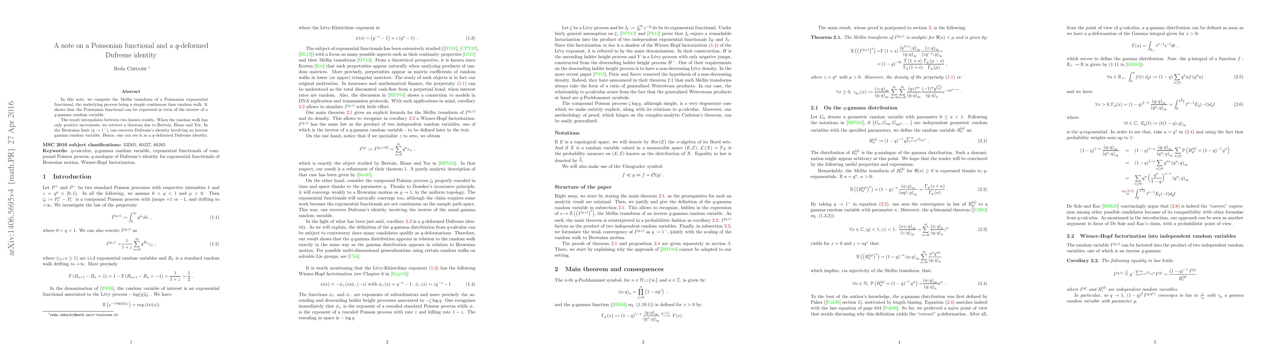 This paper computes the Mellin transform of a Poissonian exponential functional, linking it to a $q$-gamma random variable. It bridges two known results: Bertoin, Biane, and Yor's theorem for random walks with positive increments, and Dufresne's identity in the Brownian limit. The result is viewed as a $q$-deformed Dufresne identity.