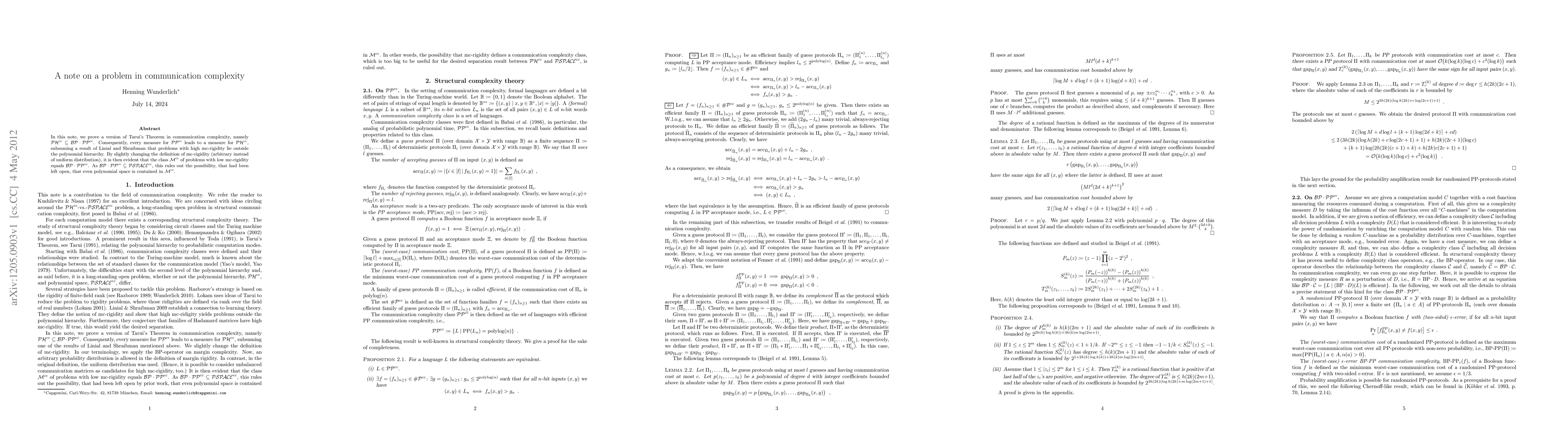 Researchers prove a version of Tarui's Theorem in communication complexity, showing that problems with high mc-rigidity lie outside the polynomial hierarchy, while also ruling out the possibility that polynomial space is contained in low mc-rigidity problems.